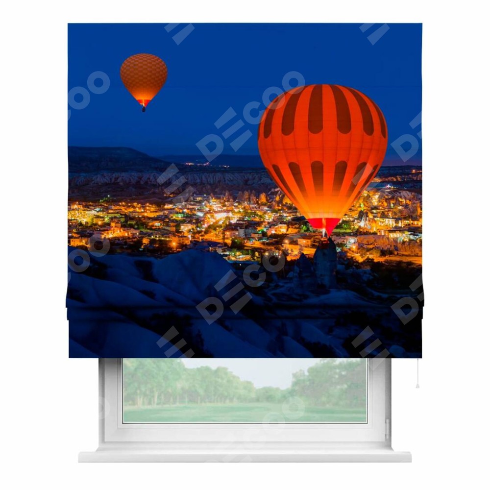 Римская штора производителя «Cortin», используется для проёма, пошита из ткани блэкаут с нанесением сублимационной печати «Воздушные шары в небе». Имеет универсальный механизм и подходит для монтажа: на потолок, на стену и в нишу.