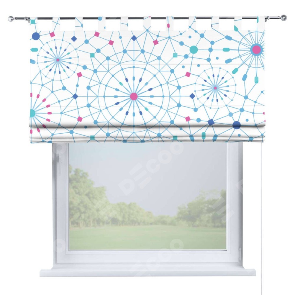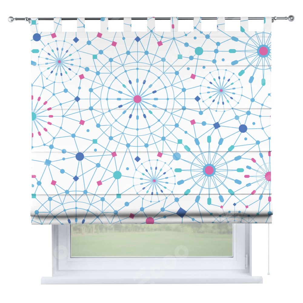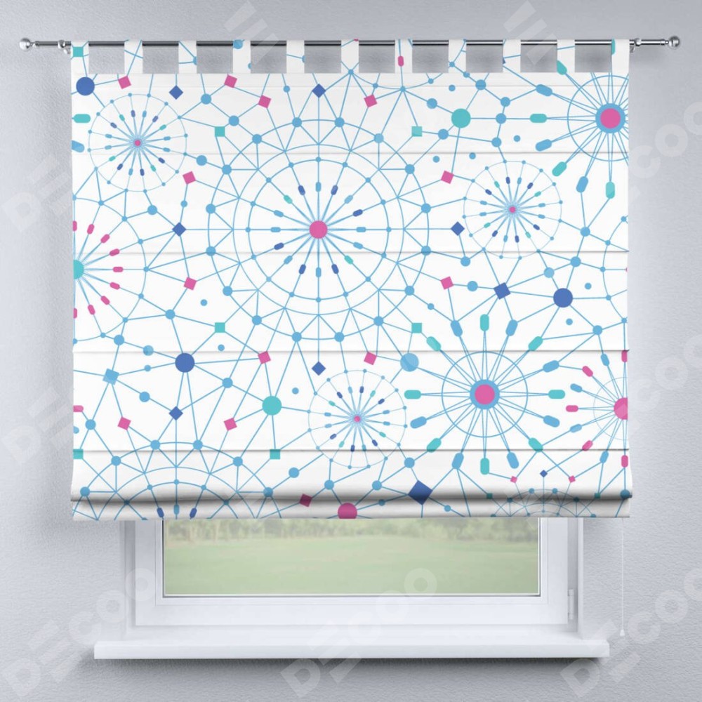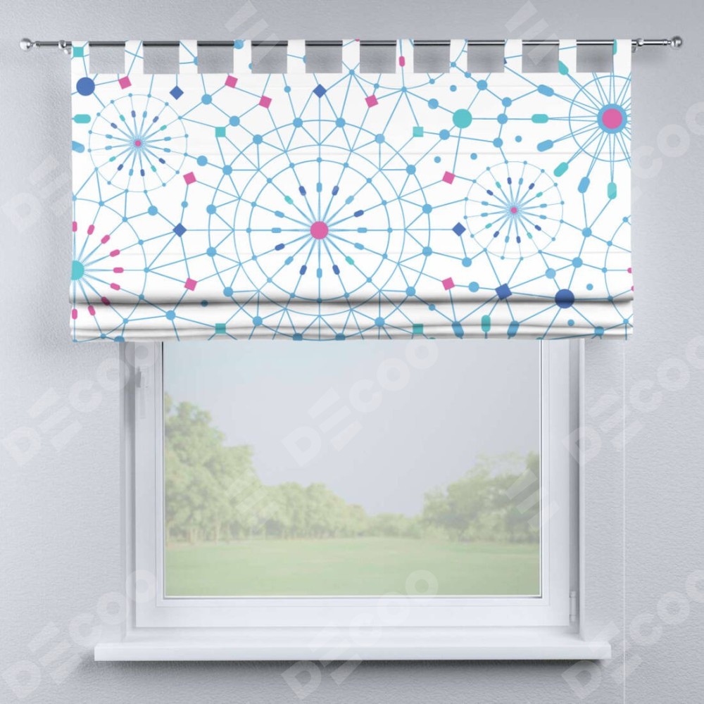Римская штора производителя «Cortin», используется для проёма, пошита из ткани блэкаут с нанесением сублимационной печати «Круги и линии». Данная модель пошита на петлях, комплектуется на выбор круглым карнизом и подходит для монтажа на стену. Римская штора на петлях имеет простую систему регулировки высоты, отличительным преимуществом данной модели является простой способ монтажа. Достаточно повесить ее на трубу и штора готова!