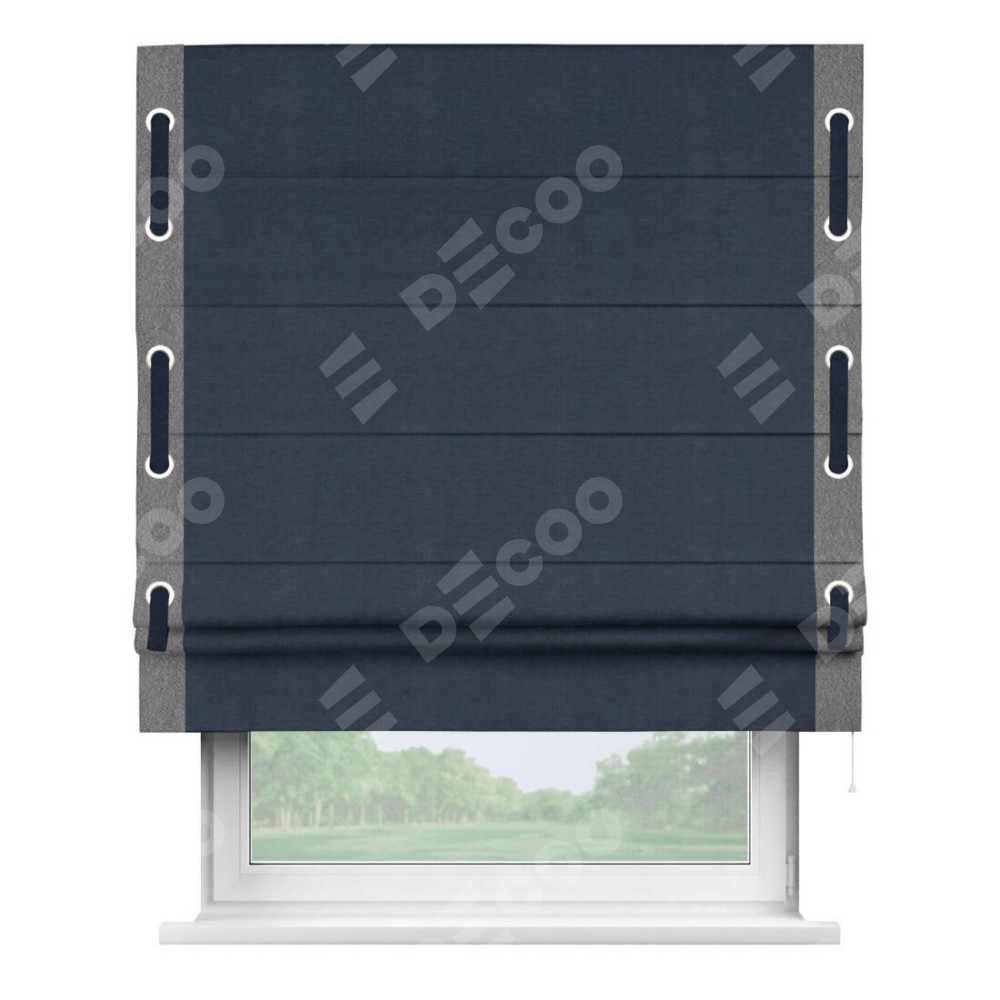 Римская штора производителя «Cortin», используется для проёма, пошита из ткани софт однотонный тёмно-синий, артикул 33111. Отделка шторы кантом «Стрим Дуо» на кантах расположены люверсы с пояском, ткань для канта используется из софта разной расцветки на выбор. Ткань для пояска обычно используется из основной ткани шторы, а так же можно сделать из любой расцветки по желанию. Имеет универсальный механизм и подходит для монтажа: на потолок, на стену и в нишу.