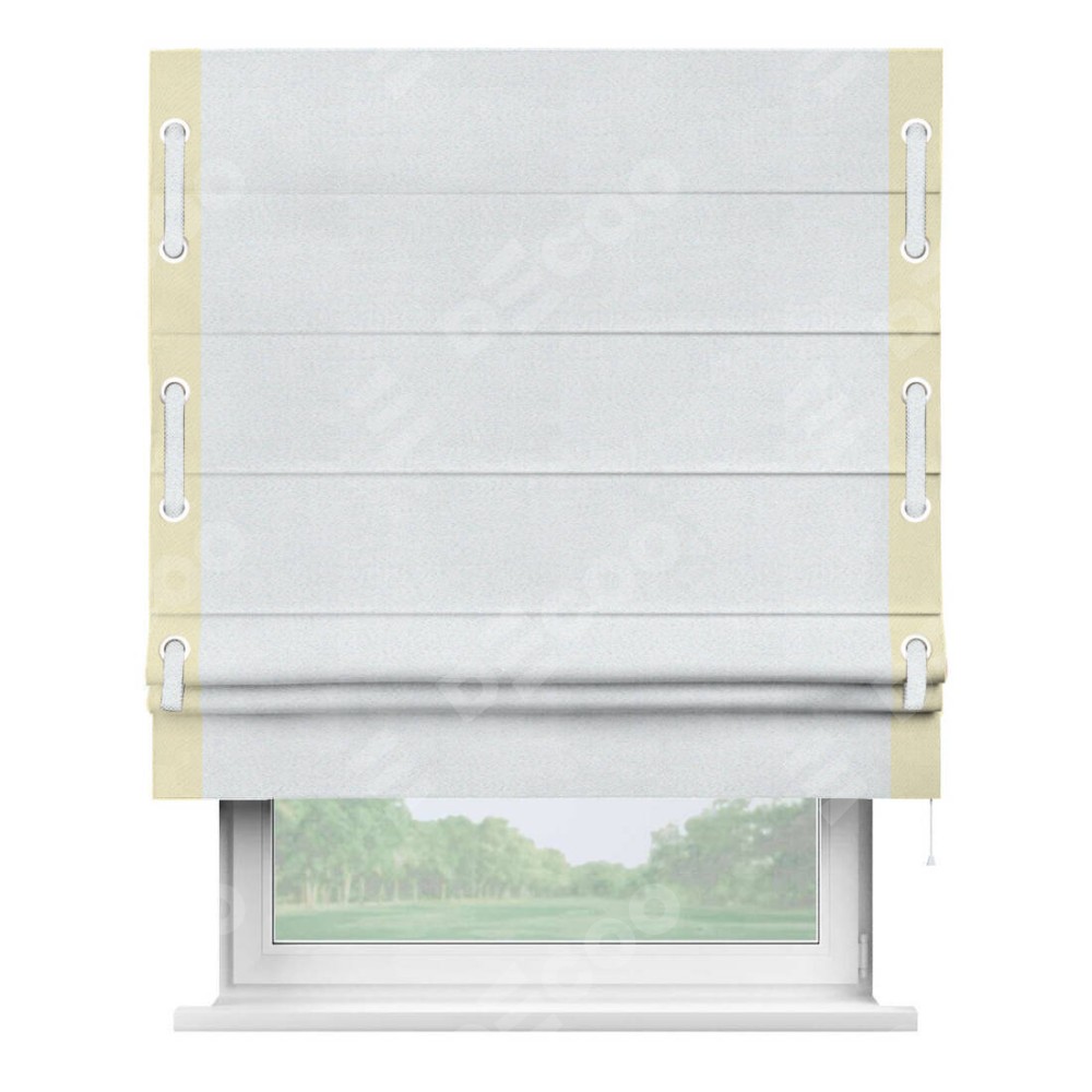 Римская штора производителя «Cortin», используется для проёма, пошита из ткани блэкаут однотонный дымчато-белый, артикул ткани 101. Отделка шторы кантом «Стрим Дуо» на кантах расположены люверсы с пояском, ткань для канта используется из блэкаута однотонного разной расцветки на выбор. Ткань для пояска обычно используется из основной ткани шторы, а так же можно сделать из любой расцветки по желанию. Имеет универсальный механизм и подходит для монтажа: на потолок, на стену и в нишу.