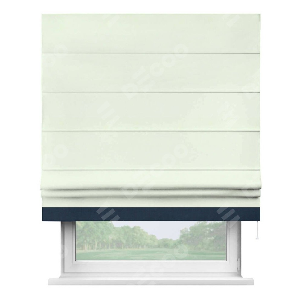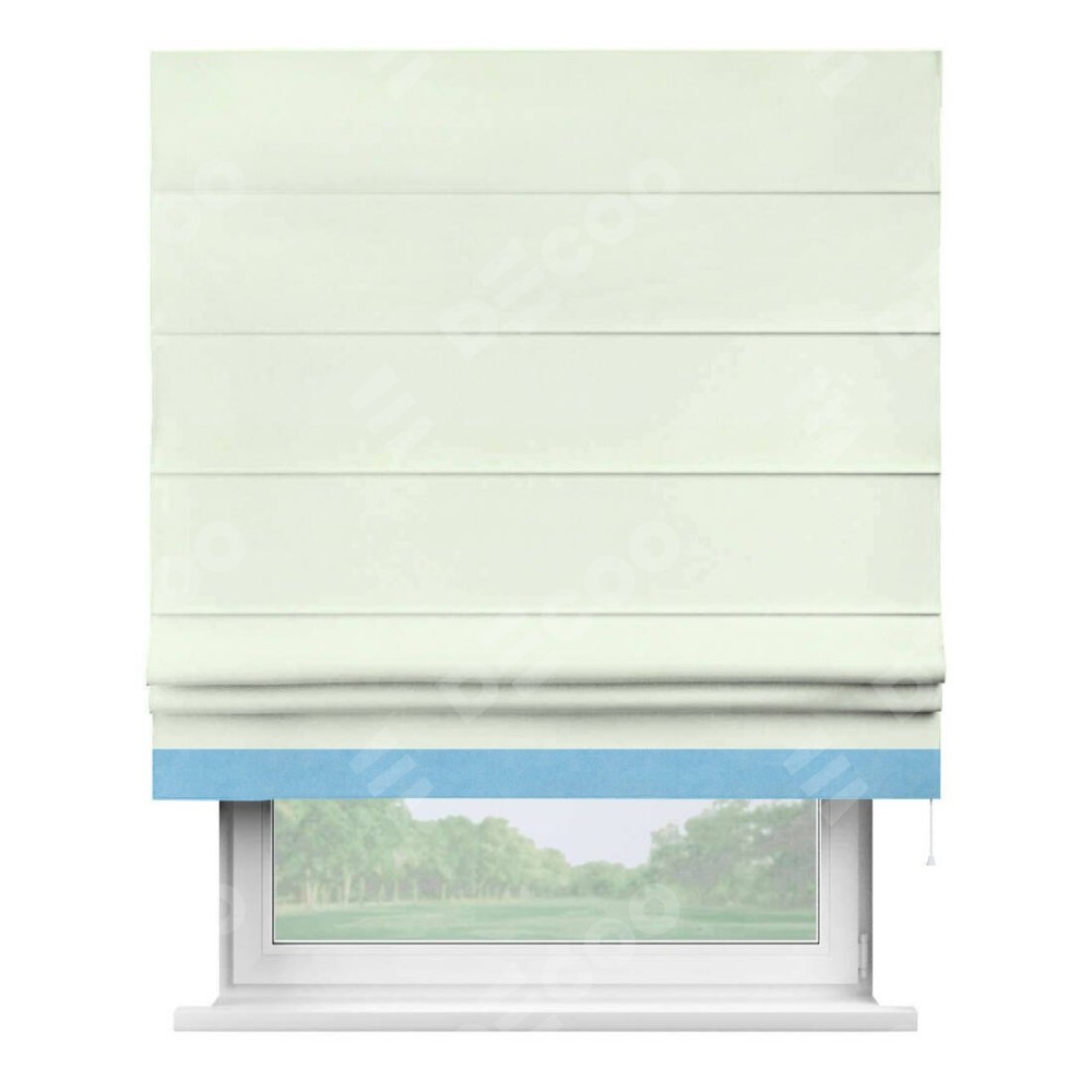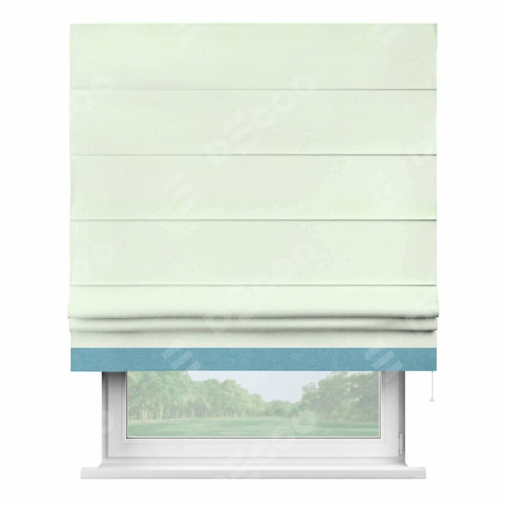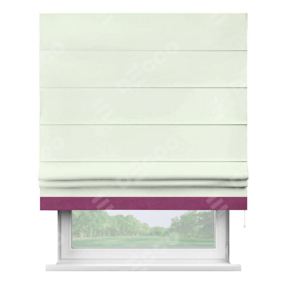 Римская штора производителя «Cortin», используется для проёма, пошита из ткани вельвет кремовый, артикул ткани 85524. Отделка шторы кантом «Джестер», ткань для канта используется из вельвета разной расцветки на выбор. Имеет универсальный механизм и подходит для монтажа: на потолок, на стену и в нишу.