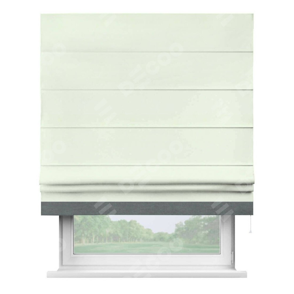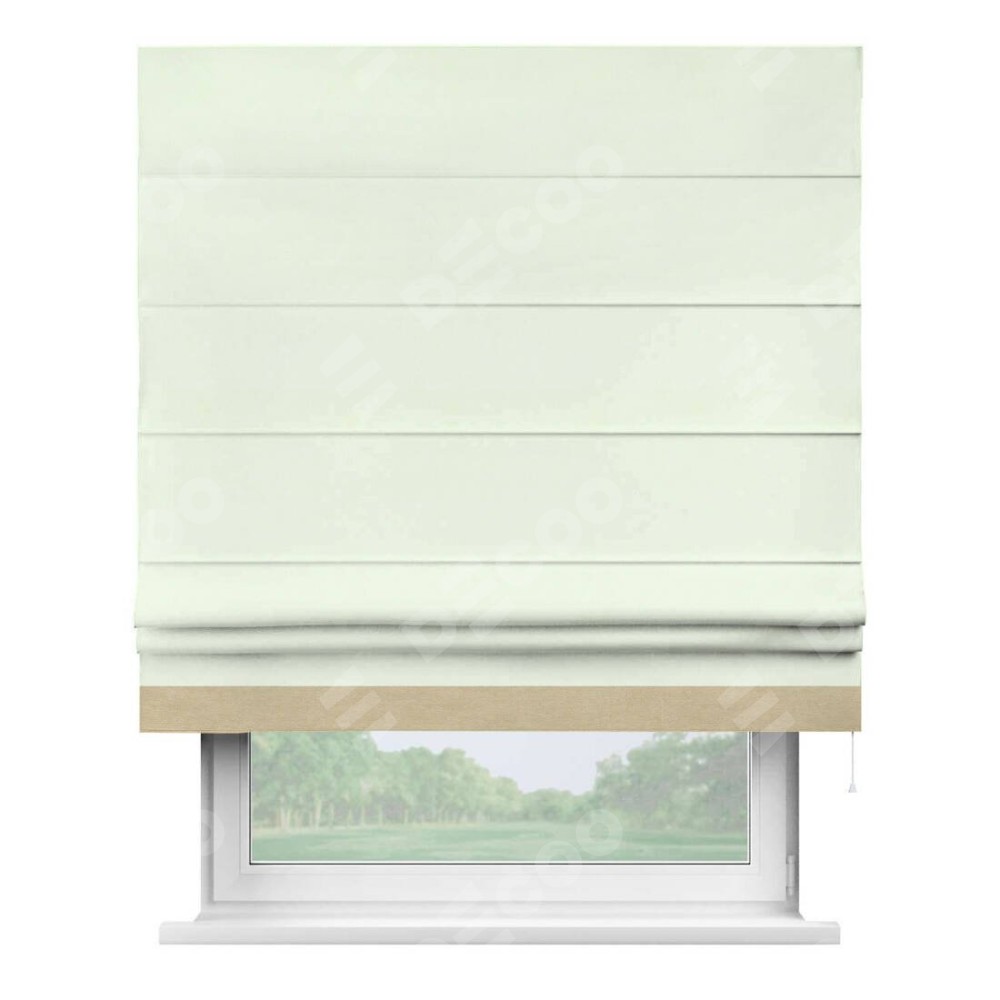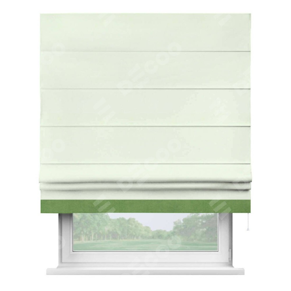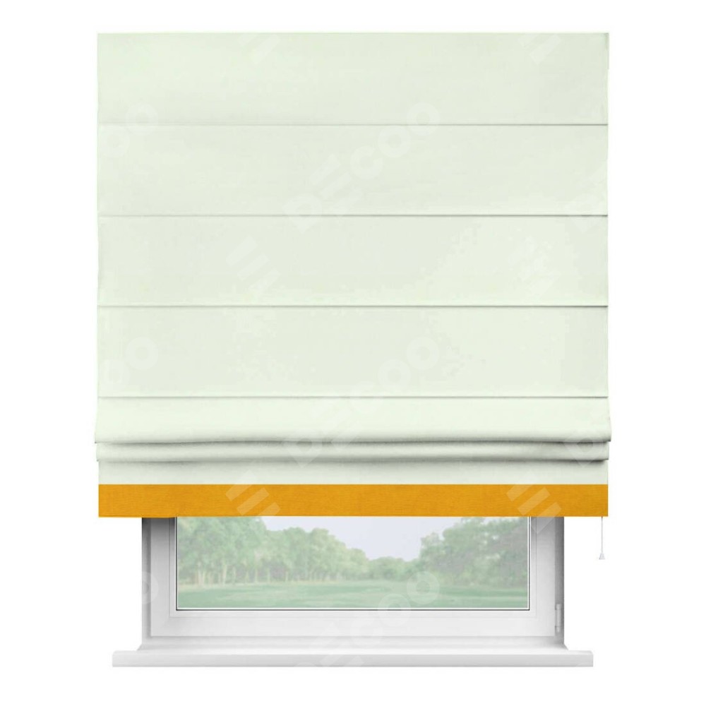 Римская штора производителя «Cortin», используется для проёма, пошита из ткани вельвет кремовый, артикул ткани 85524. Отделка шторы кантом «Джестер», ткань для канта используется из вельвета разной расцветки на выбор. Имеет универсальный механизм и подходит для монтажа: на потолок, на стену и в нишу.