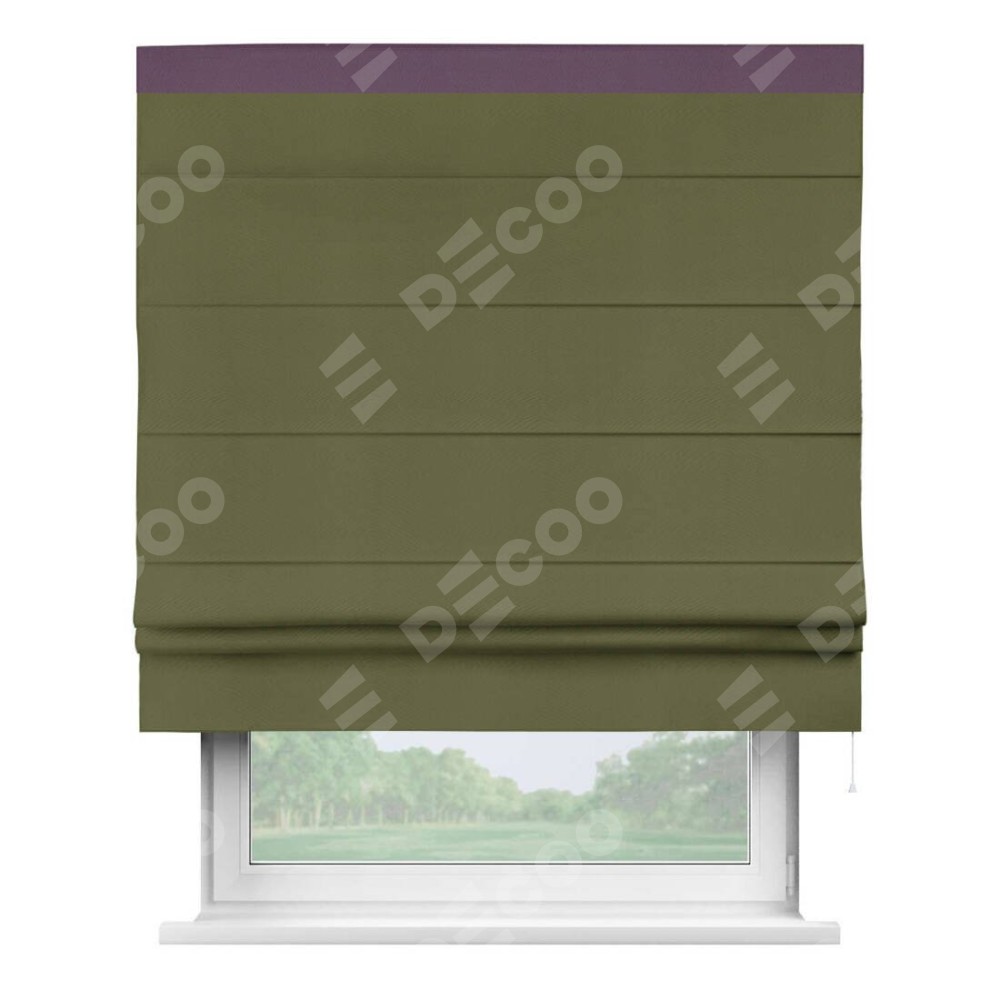 Римская штора производителя «Cortin», используется для проёма, пошита из ткани блэкаут однотонный зелёный, артикул ткани 81859. Отделка шторы кантом «Кинг», ткань для канта используется из блэкаута однотонного разной расцветки на выбор. Имеет универсальный механизм и подходит для монтажа: на потолок, на стену и в нишу.