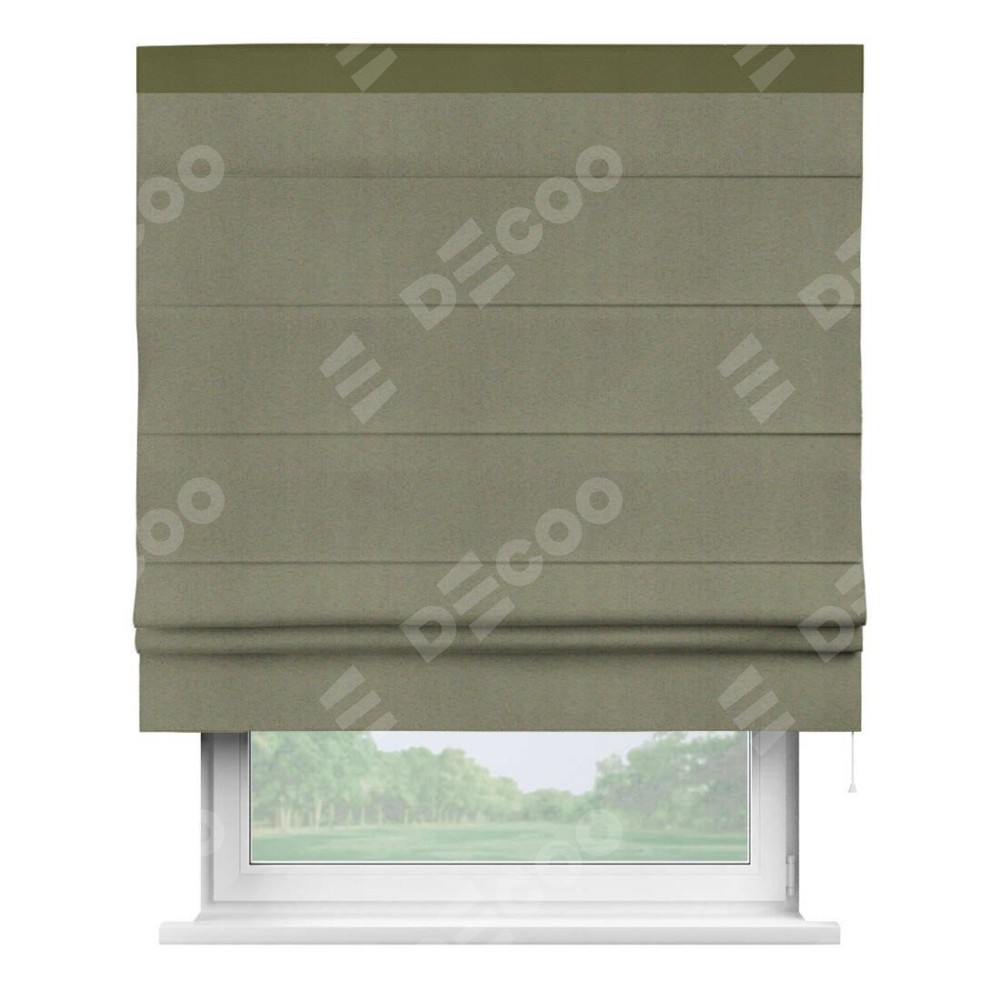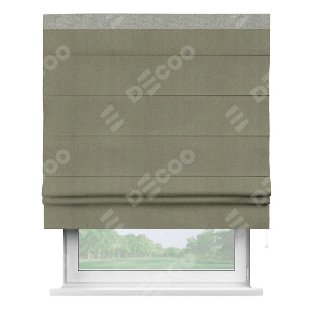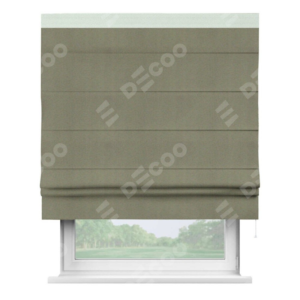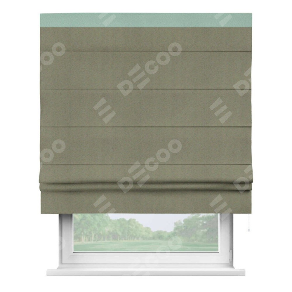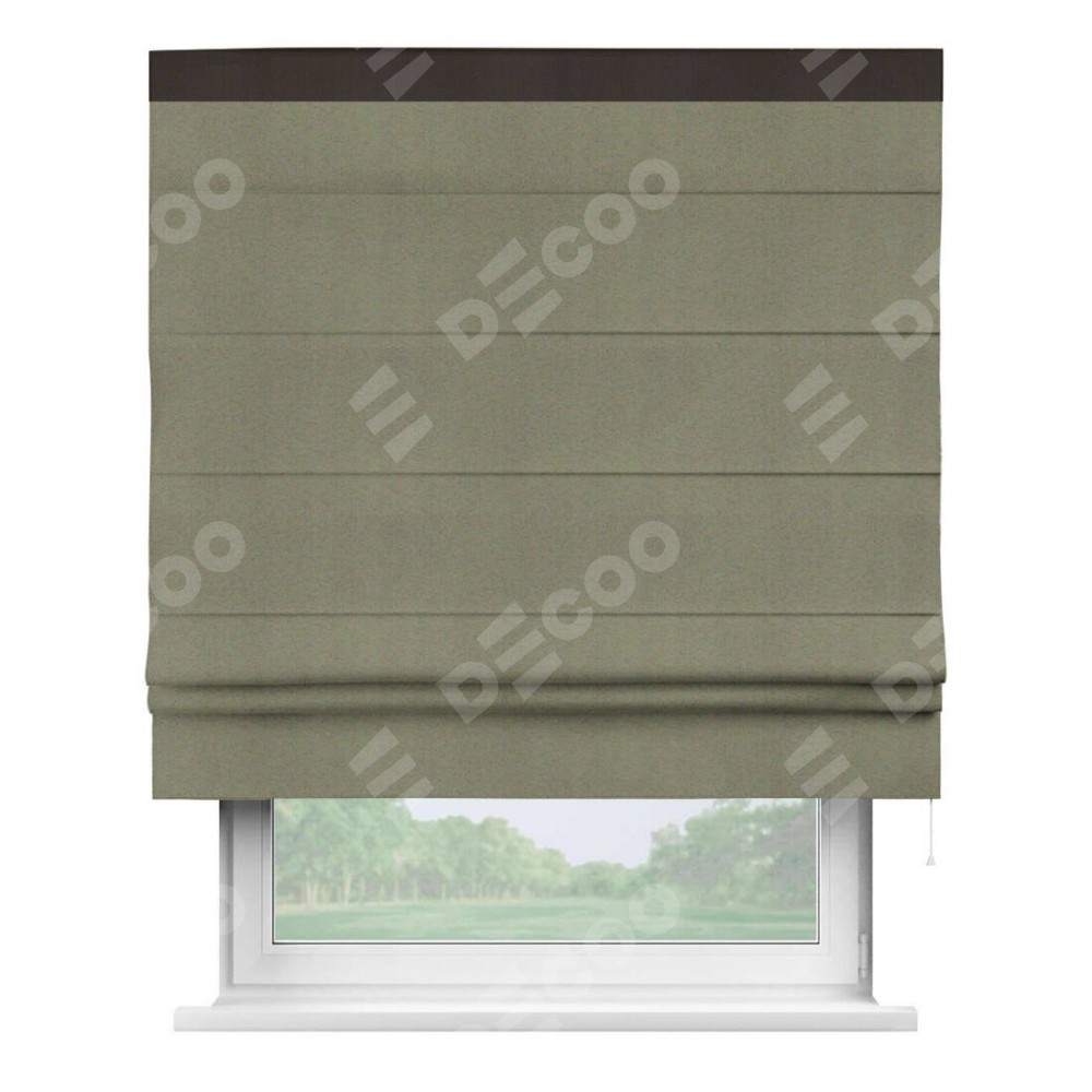 Римская штора производителя «Cortin», используется для проёма, пошита из ткани блэкаут однотонный серо-коричневый, артикул ткани 29568. Отделка шторы кантом «Кинг», ткань для канта используется из блэкаута однотонного разной расцветки на выбор. Имеет универсальный механизм и подходит для монтажа: на потолок, на стену и в нишу.