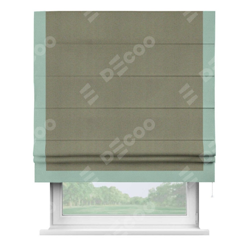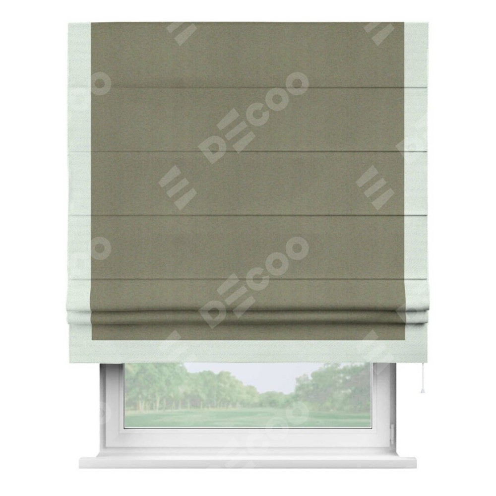 Римская штора производителя «Cortin», используется для проёма, пошита из ткани блэкаут однотонный серо-коричневый, артикул ткани 29568. Отделка шторы кантом «Виктория», ткань для канта используется из блэкаута однотонного разной расцветки на выбор. Имеет универсальный механизм и подходит для монтажа: на потолок, на стену и в нишу.