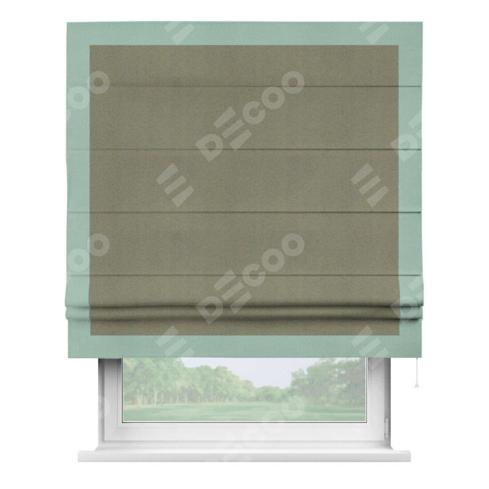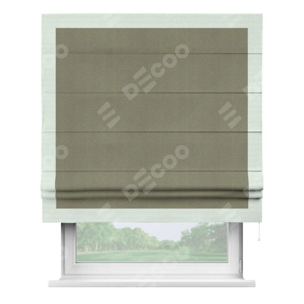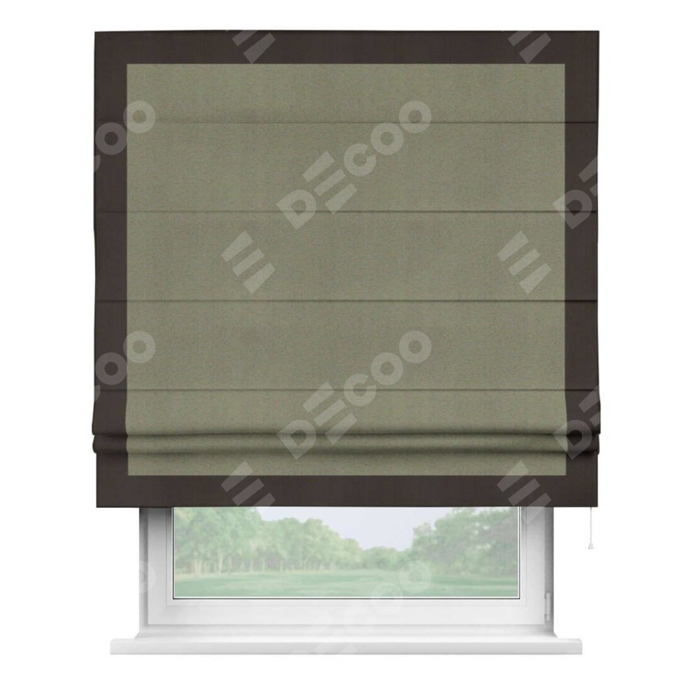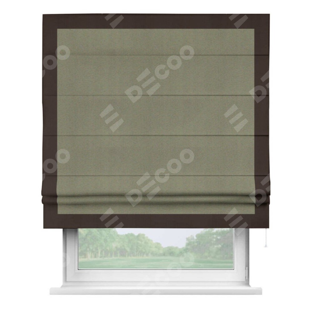 Римская штора производителя «Cortin», используется для проёма, пошита из ткани блэкаут однотонный серо-коричневый, артикул ткани 29568. Отделка шторы кантом «Чесс», ткань для канта используется из блэкаута однотонного разной расцветки на выбор. Имеет универсальный механизм и подходит для монтажа: на потолок, на стену и в нишу.