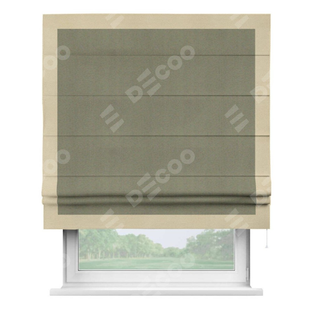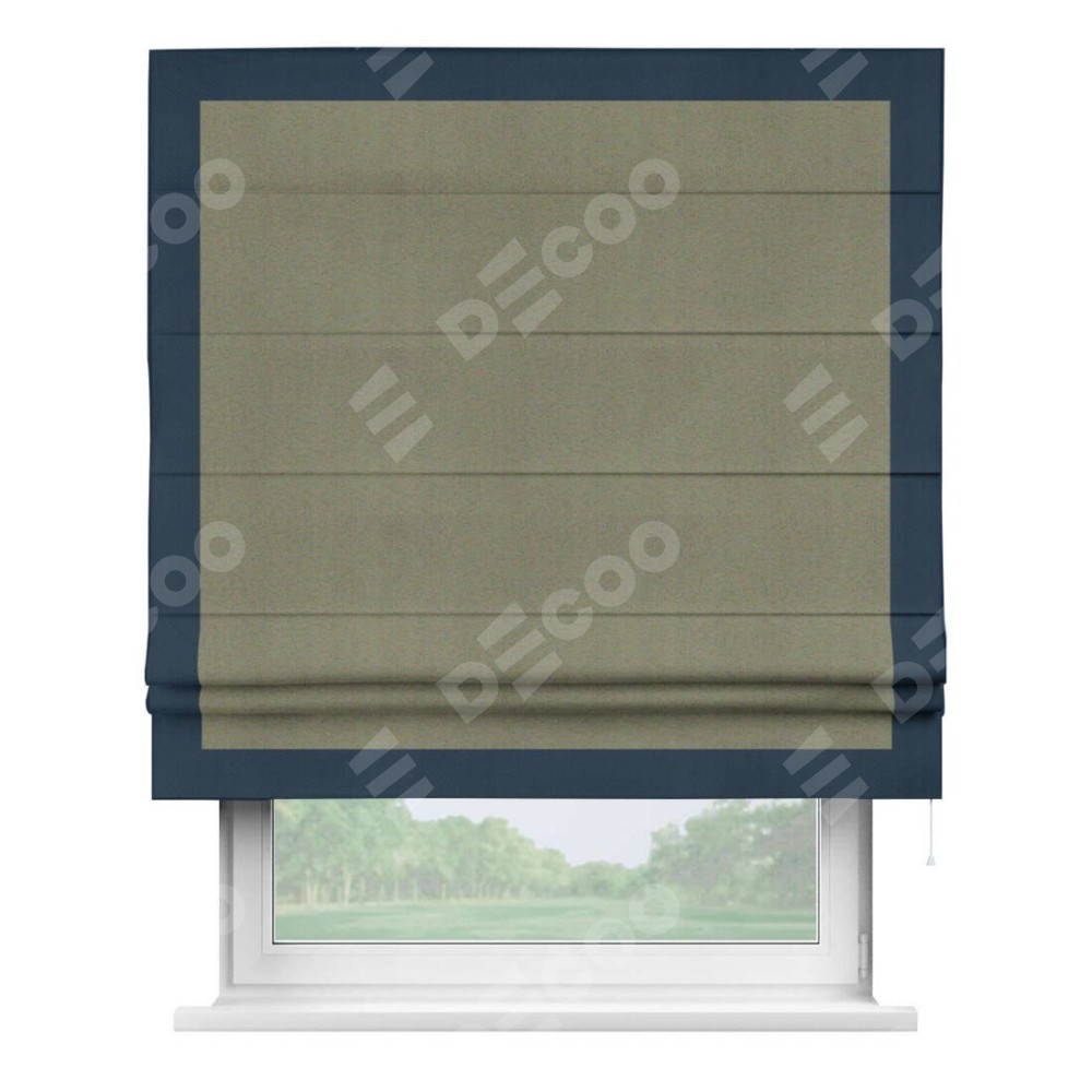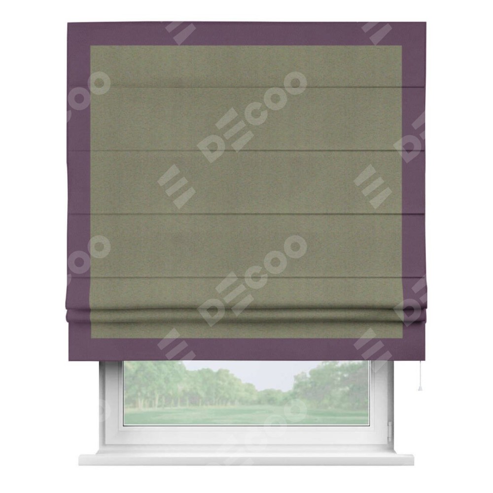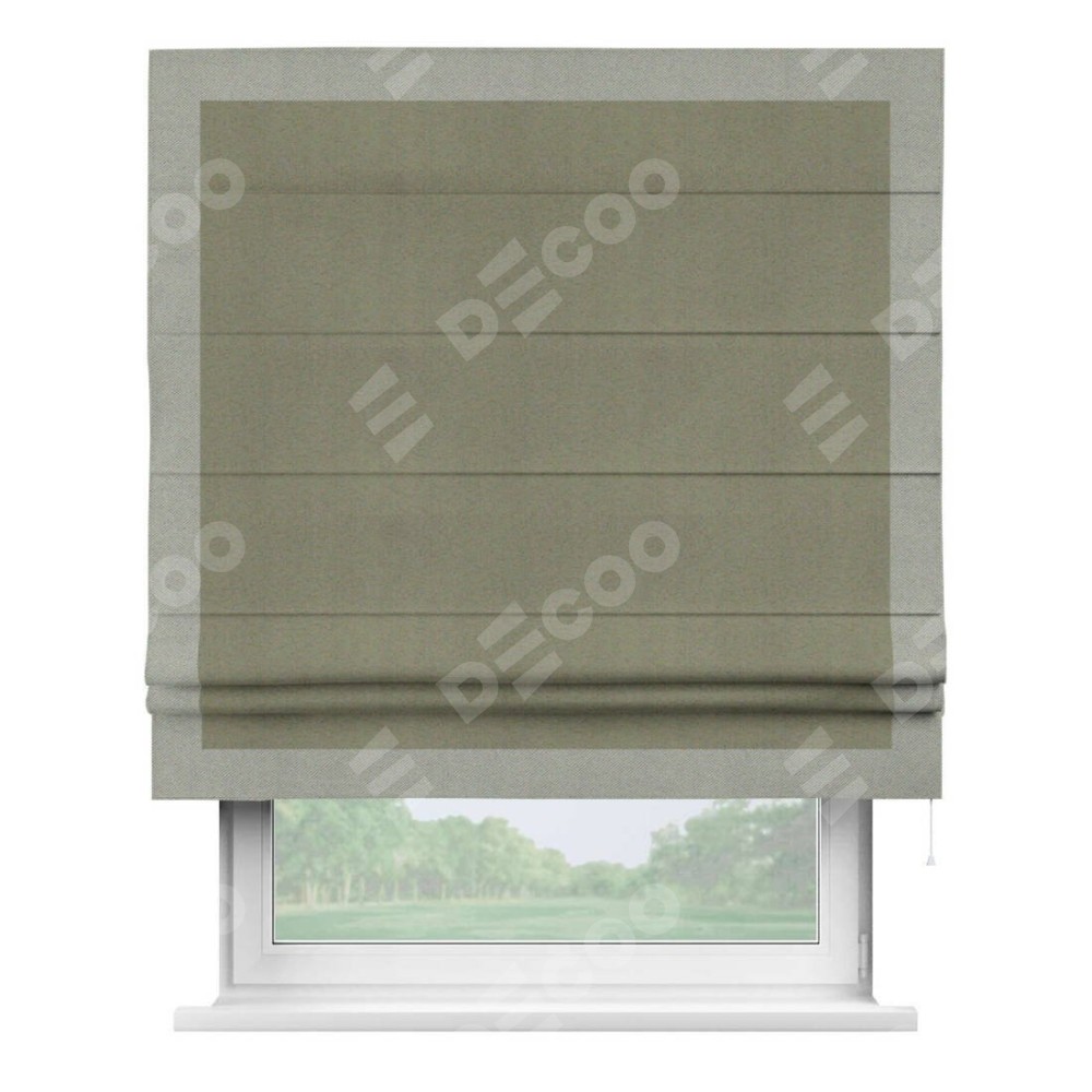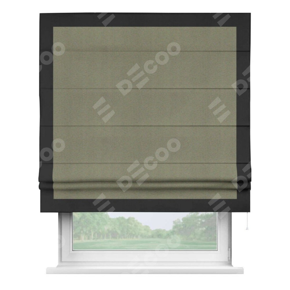 Римская штора производителя «Cortin», используется для проёма, пошита из ткани блэкаут однотонный серо-коричневый, артикул ткани 29568. Отделка шторы кантом «Чесс», ткань для канта используется из блэкаута однотонного разной расцветки на выбор. Имеет универсальный механизм и подходит для монтажа: на потолок, на стену и в нишу.