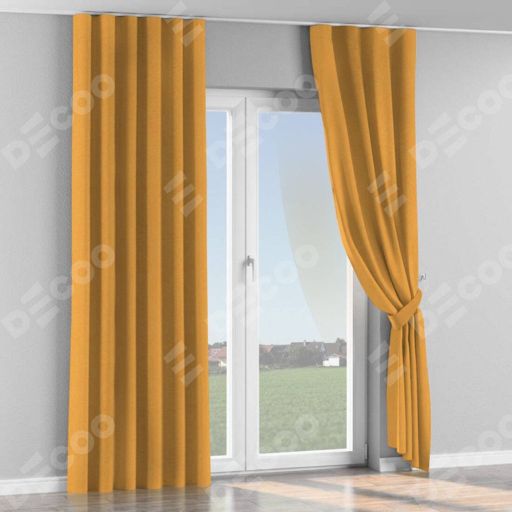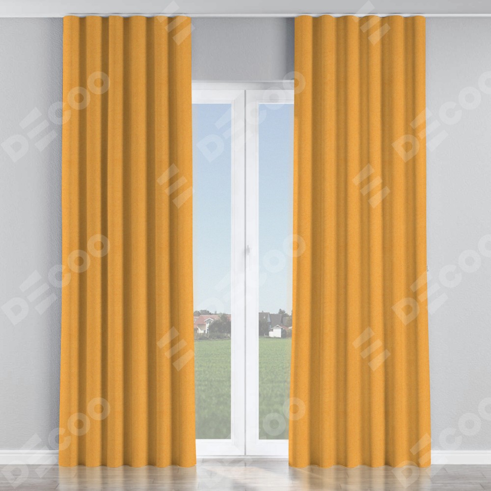 Комплект прямых штор, от производителя «Cortin», пошиты из ткани блэкаут с блеском золотой, артикул ткани 34626. С изнаночной стороны в верхней части штор пристрачивается шторная лента с декоративными складками «Волна». Обратная сторона основного материала черного цвета, что обеспечивает необходимую светонепроницаемость. Для создания элегантных складок прямые шторы шьются по стандарту с коэффициентом 1:2 (на 100 см. ширины проёма 200 см. ширины ткани).