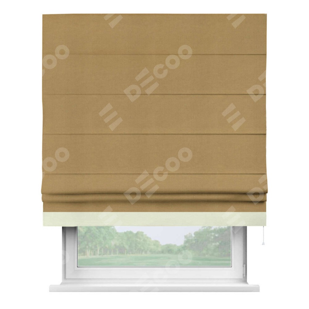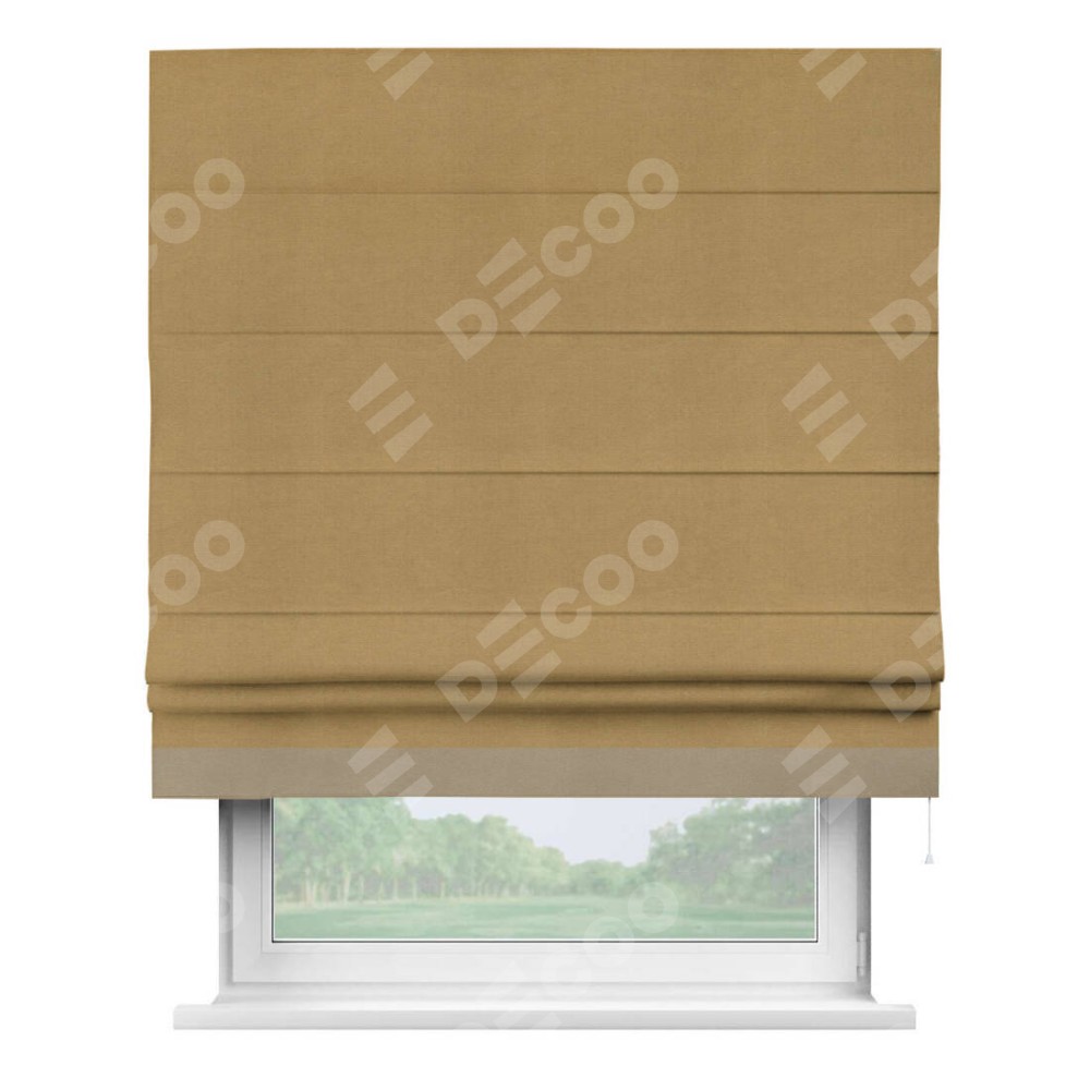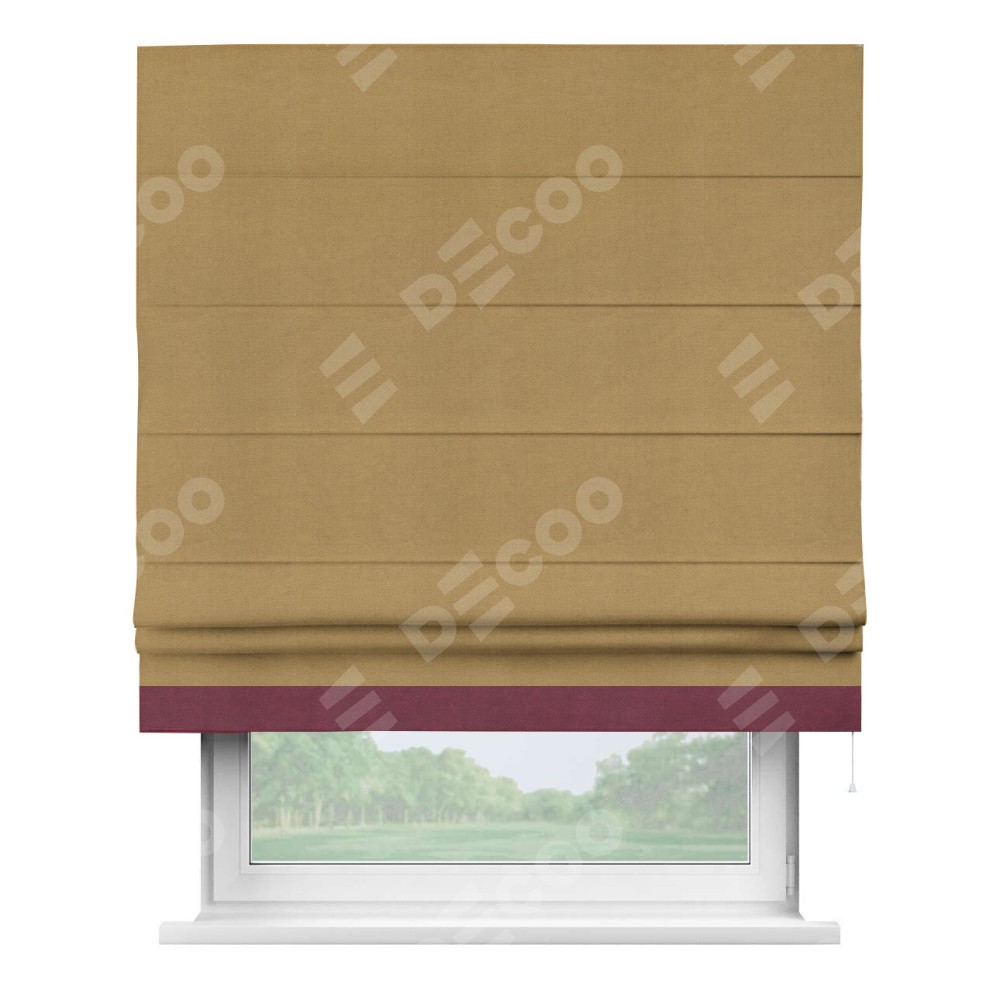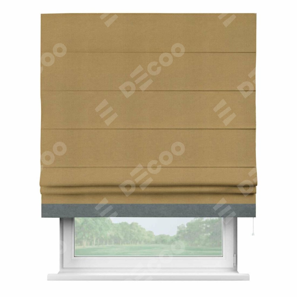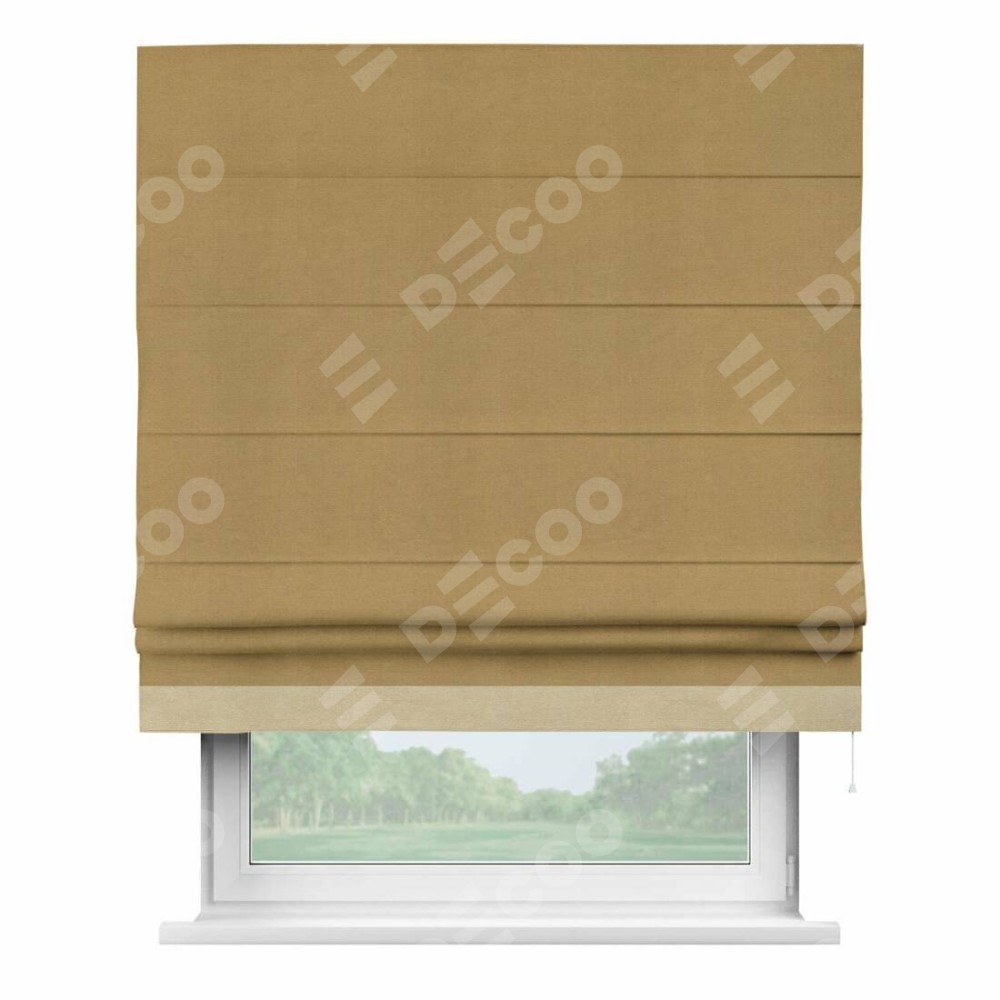 Римская штора производителя «Cortin», используется для проёма, пошита из ткани вельвет горчица, артикул ткани 17760. Отделка шторы кантом «Джестер», ткань для канта используется из вельвета разной расцветки на выбор. Имеет универсальный механизм и подходит для монтажа: на потолок, на стену и в нишу.