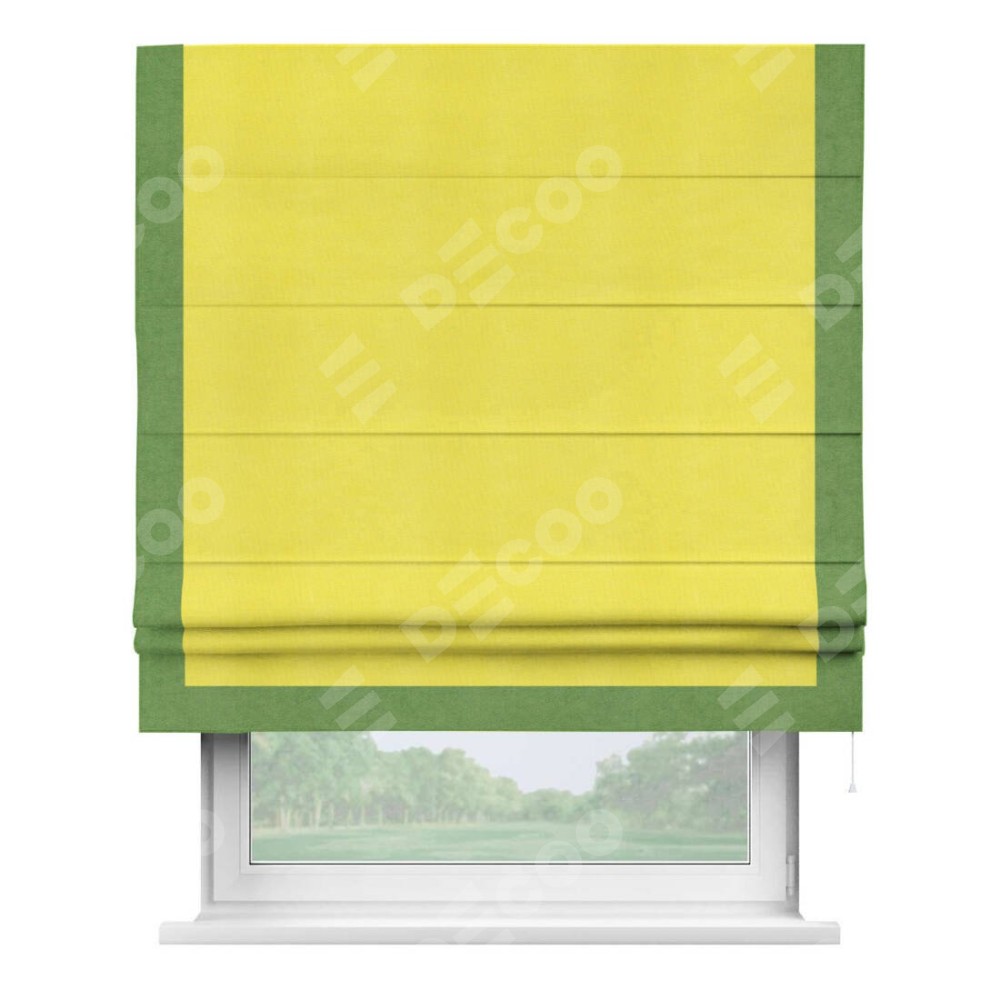 Римская штора производителя «Cortin», используется для проёма, пошита из ткани вельвет cветло-желтый, артикул ткани 30997. Отделка шторы кантом «Виктория», ткань для канта используется из вельвета разной расцветки на выбор. Имеет универсальный механизм и подходит для монтажа: на потолок, на стену и в нишу.