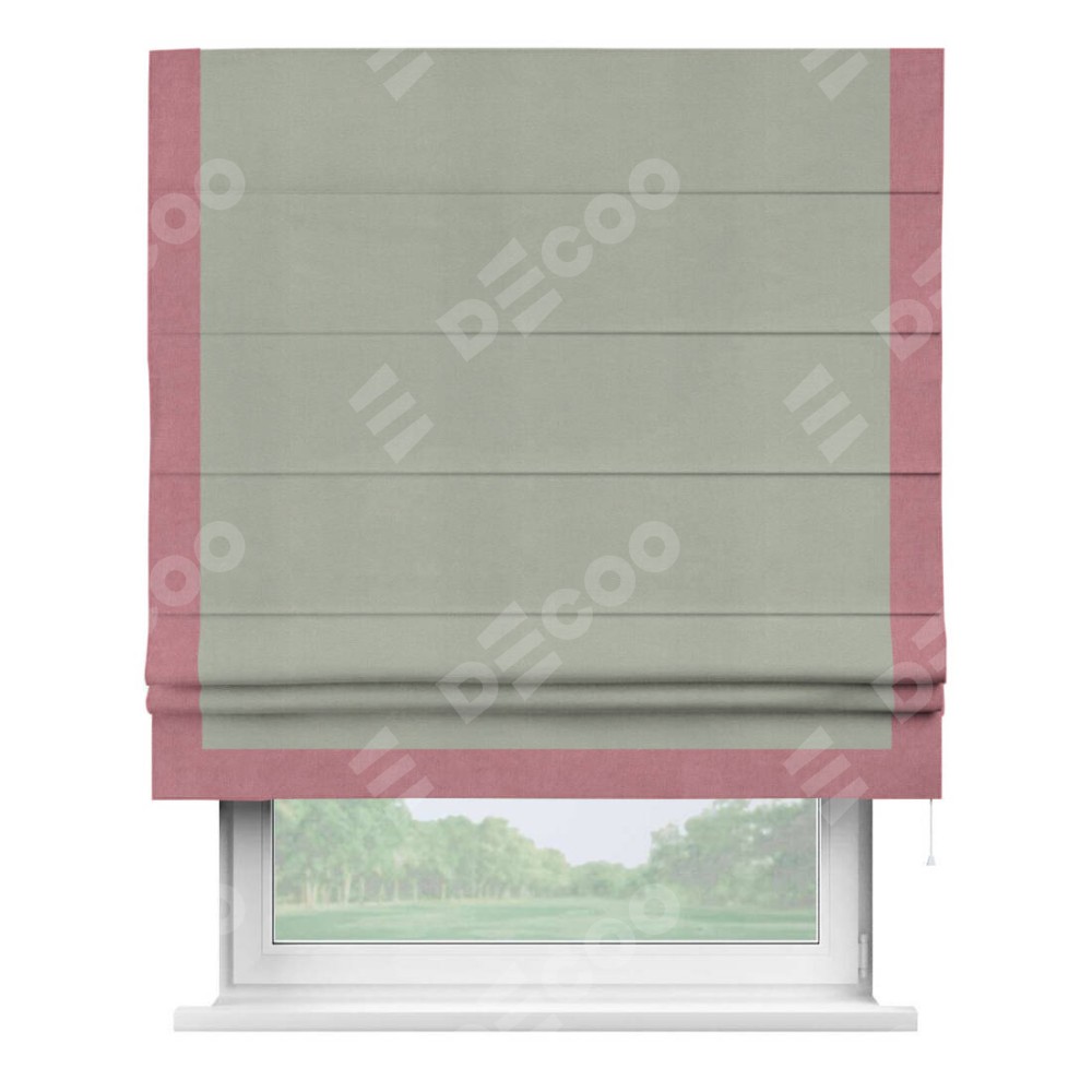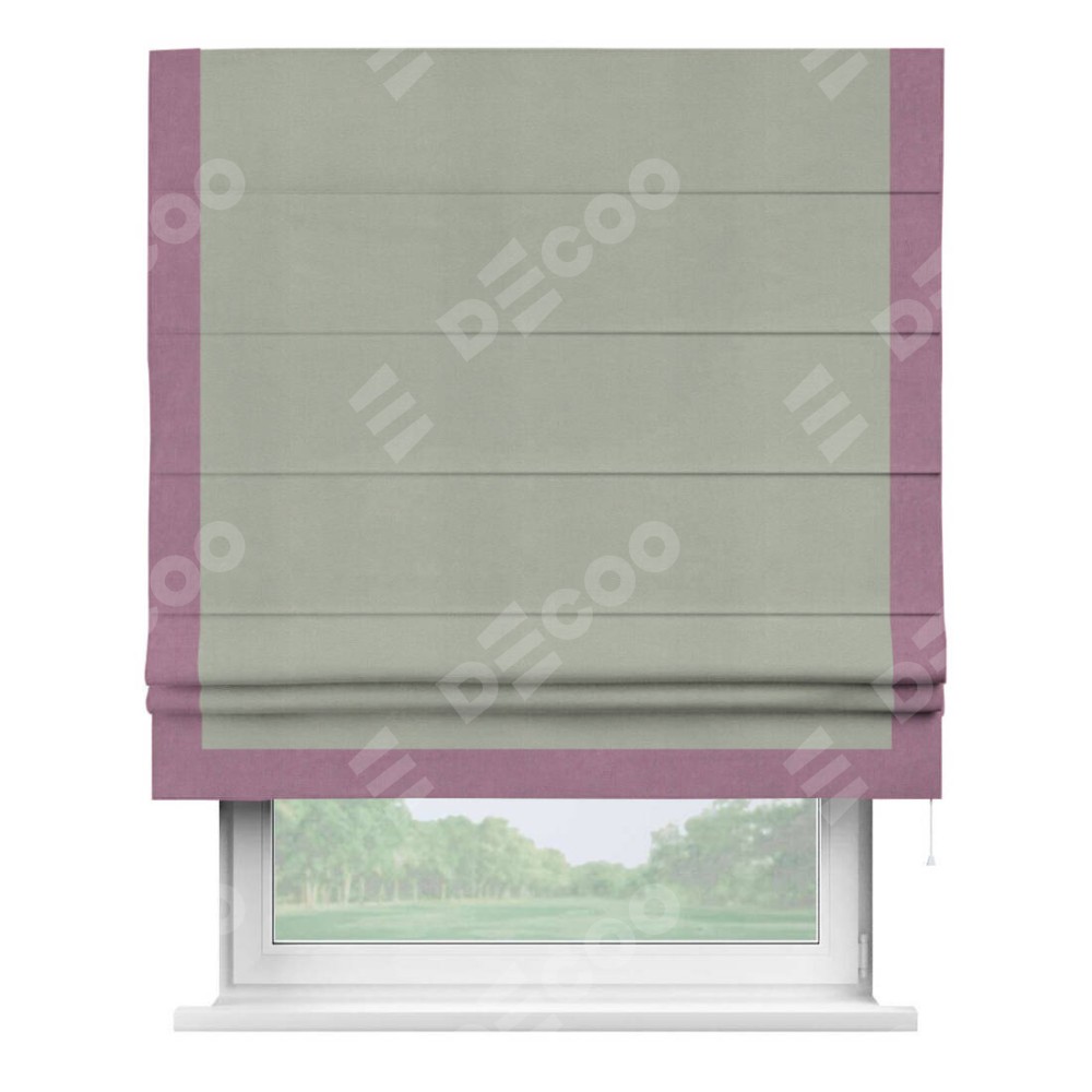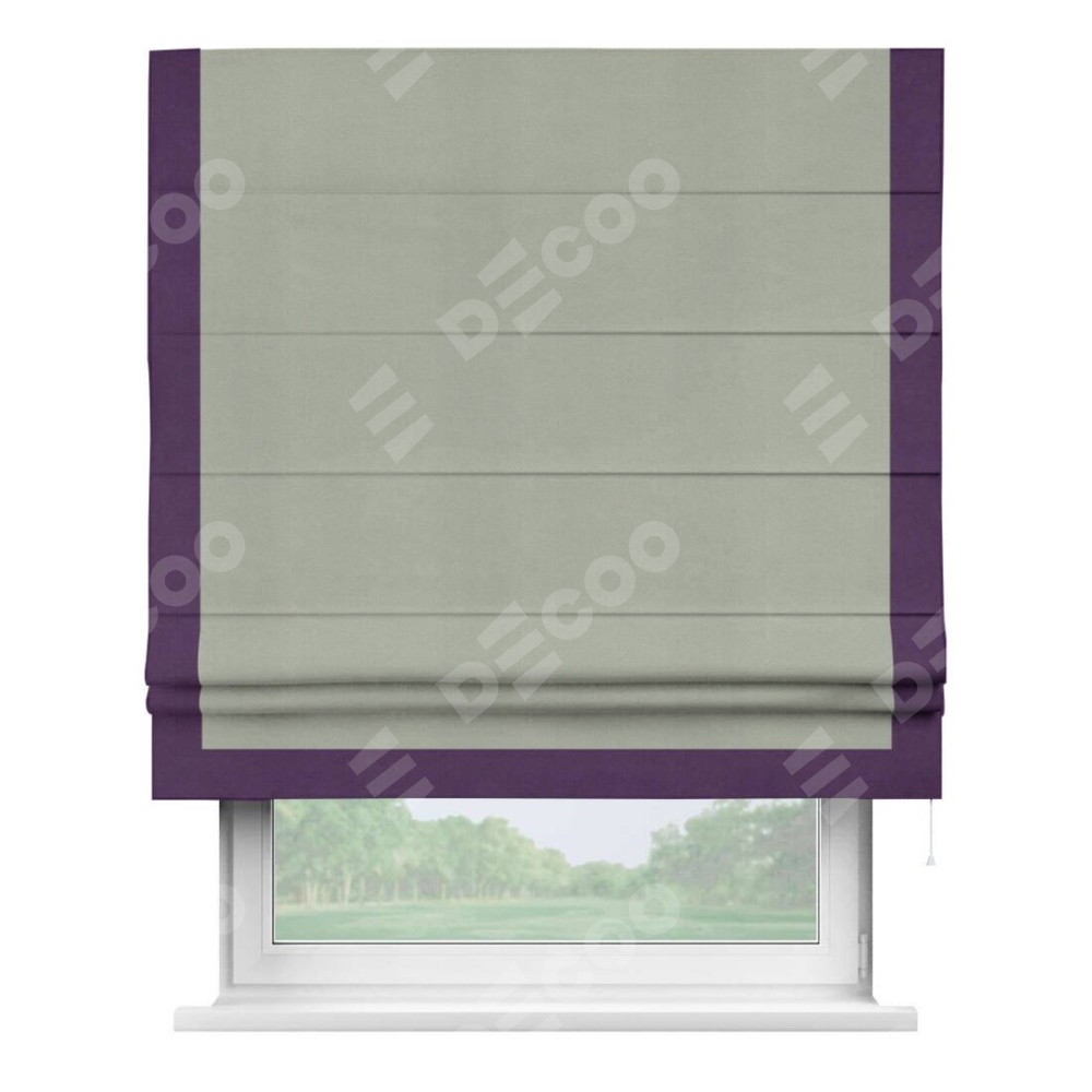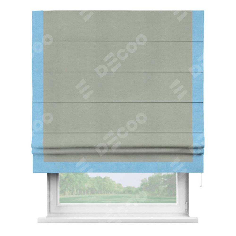 Римская штора производителя «Cortin», используется для проёма, пошита из ткани вельвет cветло-серый, артикул ткани 30981. Отделка шторы кантом «Виктория», ткань для канта используется из вельвета разной расцветки на выбор. Имеет универсальный механизм и подходит для монтажа: на потолок, на стену и в нишу.