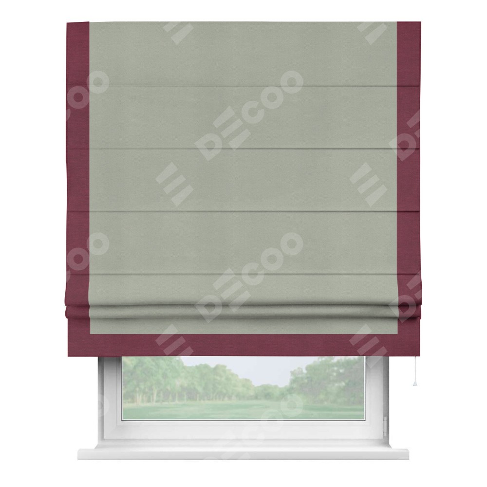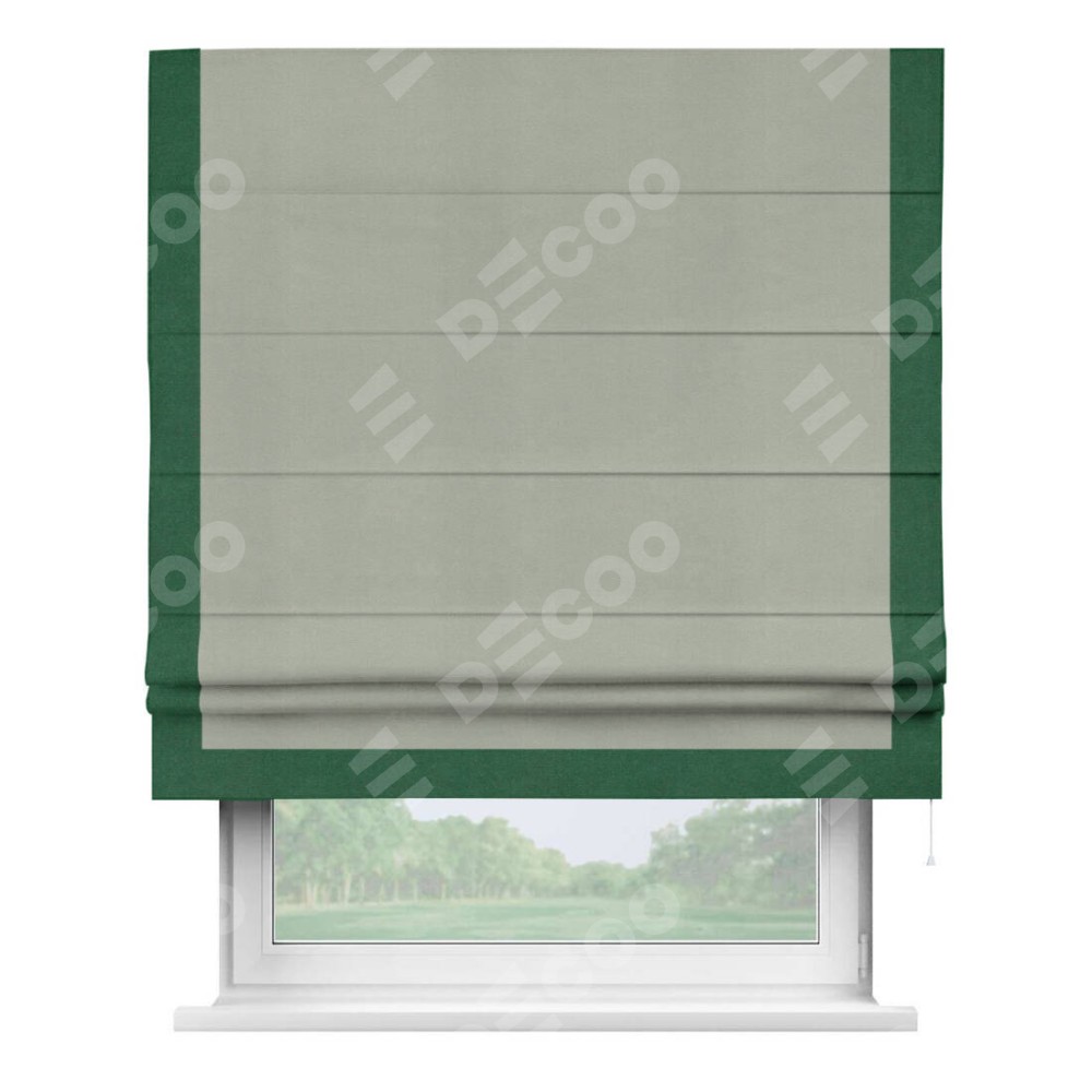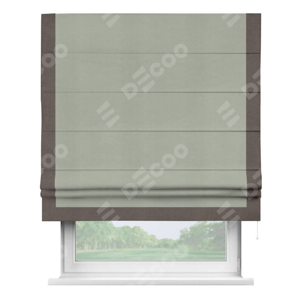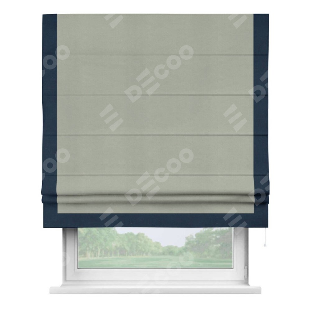 Римская штора производителя «Cortin», используется для проёма, пошита из ткани вельвет cветло-серый, артикул ткани 30981. Отделка шторы кантом «Виктория», ткань для канта используется из вельвета разной расцветки на выбор. Имеет универсальный механизм и подходит для монтажа: на потолок, на стену и в нишу.