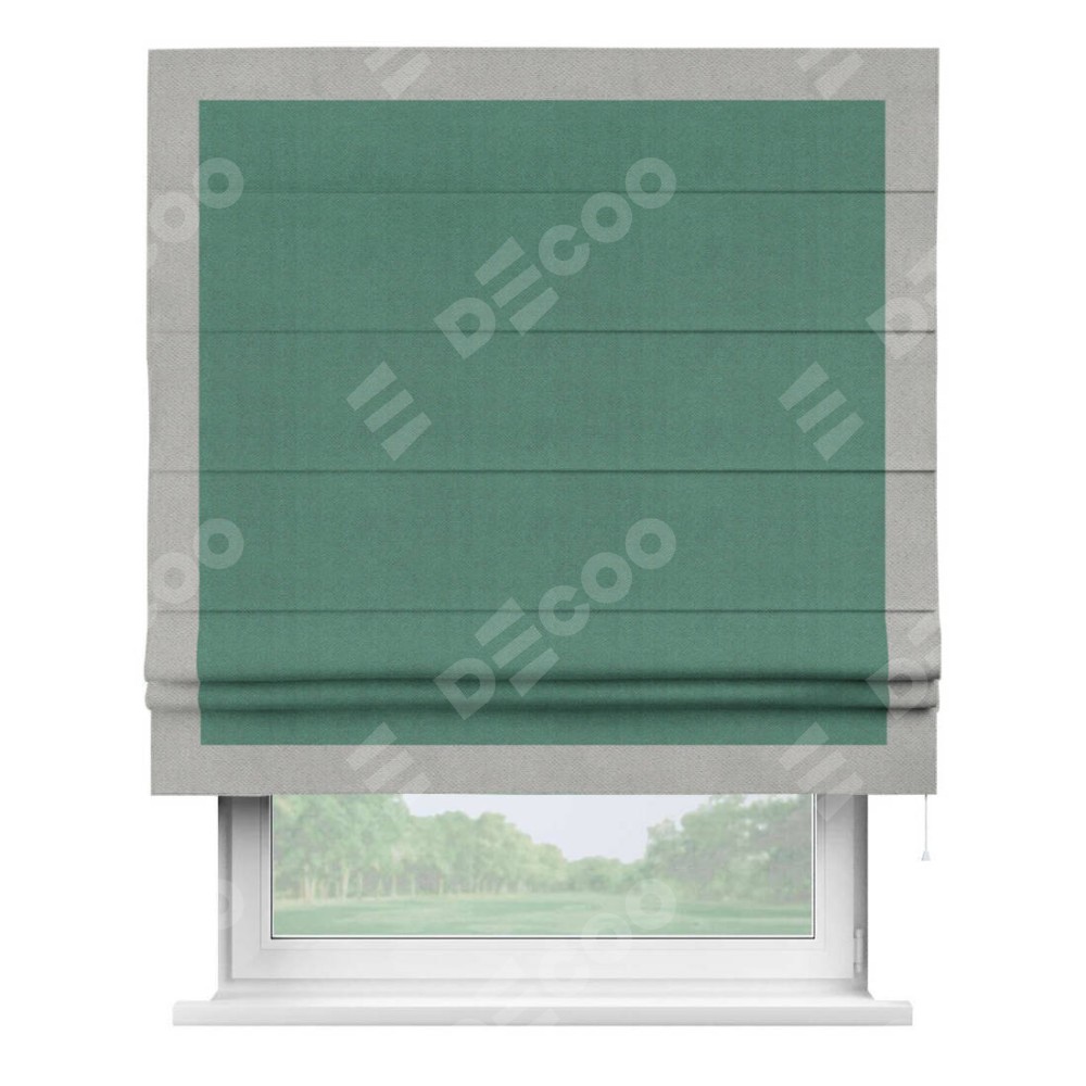Римская штора производителя «Cortin», используется для проёма, пошита из ткани блэкаут с блеском изумрудный, артикул 34628. Отделка шторы кантом «Чесс», ткань для канта используется из блэкаута с блеском разной расцветки на выбор. Изнаночная сторона материала черного цвета, что обеспечивает необходимую светонепроницаемость. Имеет универсальный механизм и подходит для монтажа: на потолок, на стену и в нишу.