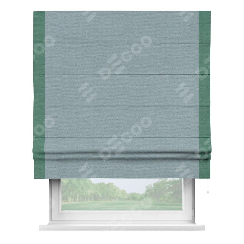 Римская штора производителя «Cortin», используется для проёма, пошита из ткани блэкаут с блеском синий, артикул 34625. Отделка шторы кантом «Стрим Дуо», ткань для канта используется из блэкаута с блеском разной расцветки на выбор. Изнаночная сторона материала черного цвета, что обеспечивает необходимую светонепроницаемость. Имеет универсальный механизм и подходит для монтажа: на потолок, на стену и в нишу.