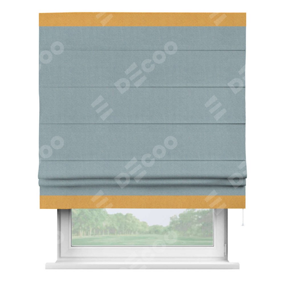 Римская штора производителя «Cortin», используется для проёма, пошита из ткани блэкаут с блеском синий, артикул 34625. Отделка шторы кантом «Горизонт», ткань для канта используется из блэкаута с блеском разной расцветки на выбор. Изнаночная сторона материала черного цвета, что обеспечивает необходимую светонепроницаемость. Имеет универсальный механизм и подходит для монтажа: на потолок, на стену и в нишу.