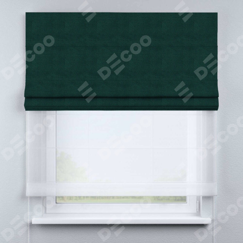 Римская штора день-ночь производителя «Cortin», используется для проёма, пошита из двух полотен, с лицевой стороны cotton блэкаут изумруд артикул 35311, вторая ткань тюль (по стандарту комплектуется тюль белого цвета артикул V-01). Имеет универсальный механизм и подходит для монтажа: на потолок, на стену и в нишу.
