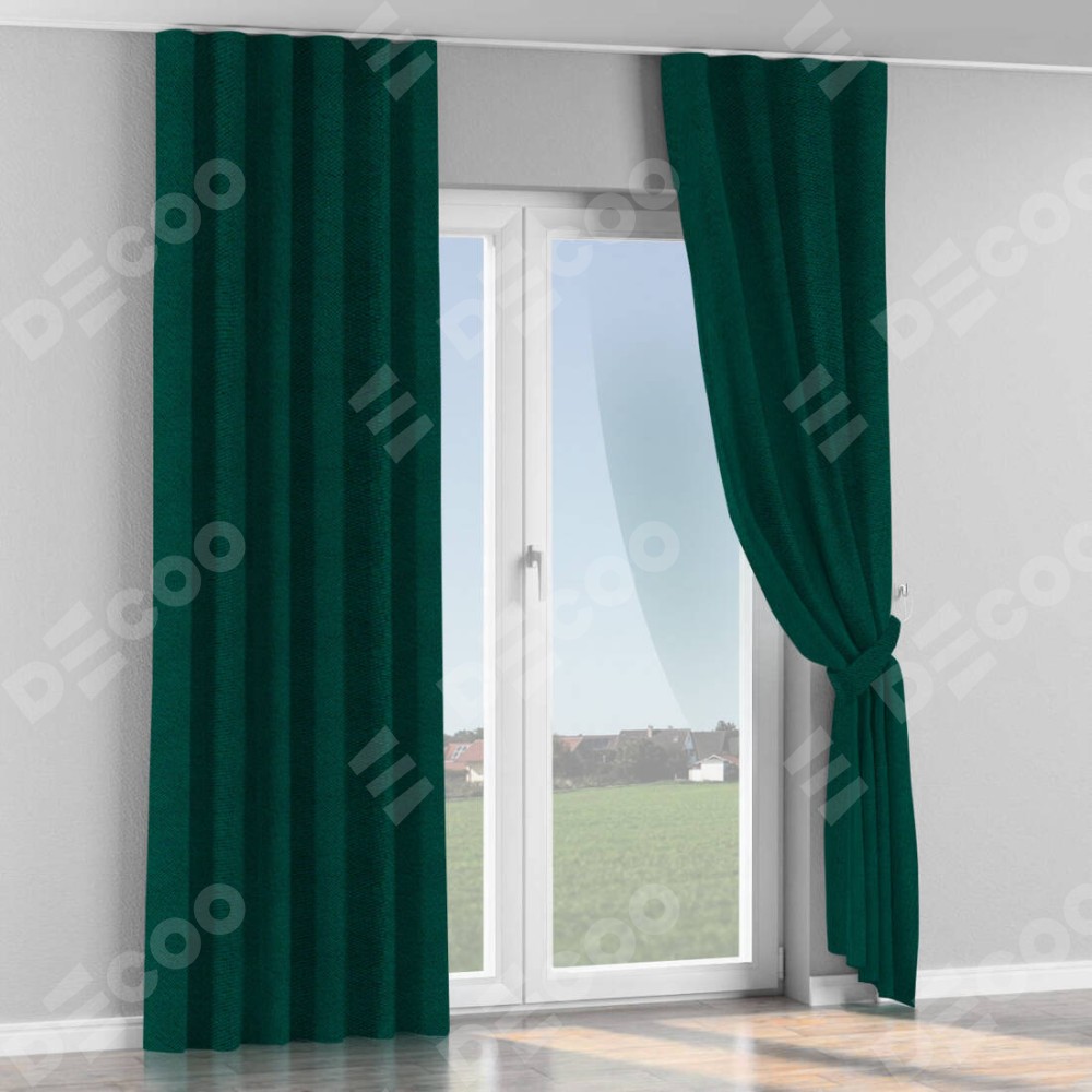 Комплект прямых штор, от производителя «Cortin», пошиты из ткани cotton блэкаут изумруд, артикул ткани 35311. С изнаночной стороны в верхней части штор пристрачивается шторная лента с декоративными складками «Волна». Для создания элегантных складок прямые шторы шьются по стандарту с коэффициентом 1:2 (на 100 см. ширины проёма 200 см. ширины ткани).