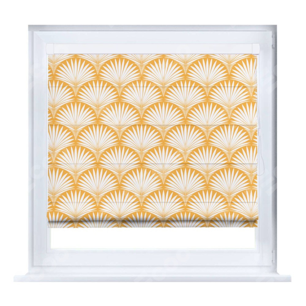 Римская штора производителя «Cortin», устанавливается на створку окна, пошита из ткани блэкаут с нанесением сублимационной печати «Арт-деко листья желтый». Штора шьётся по индивидуальным размерам, для данного типа римской шторы возможная ширина от 35 до 150 см., высота до 250 см.