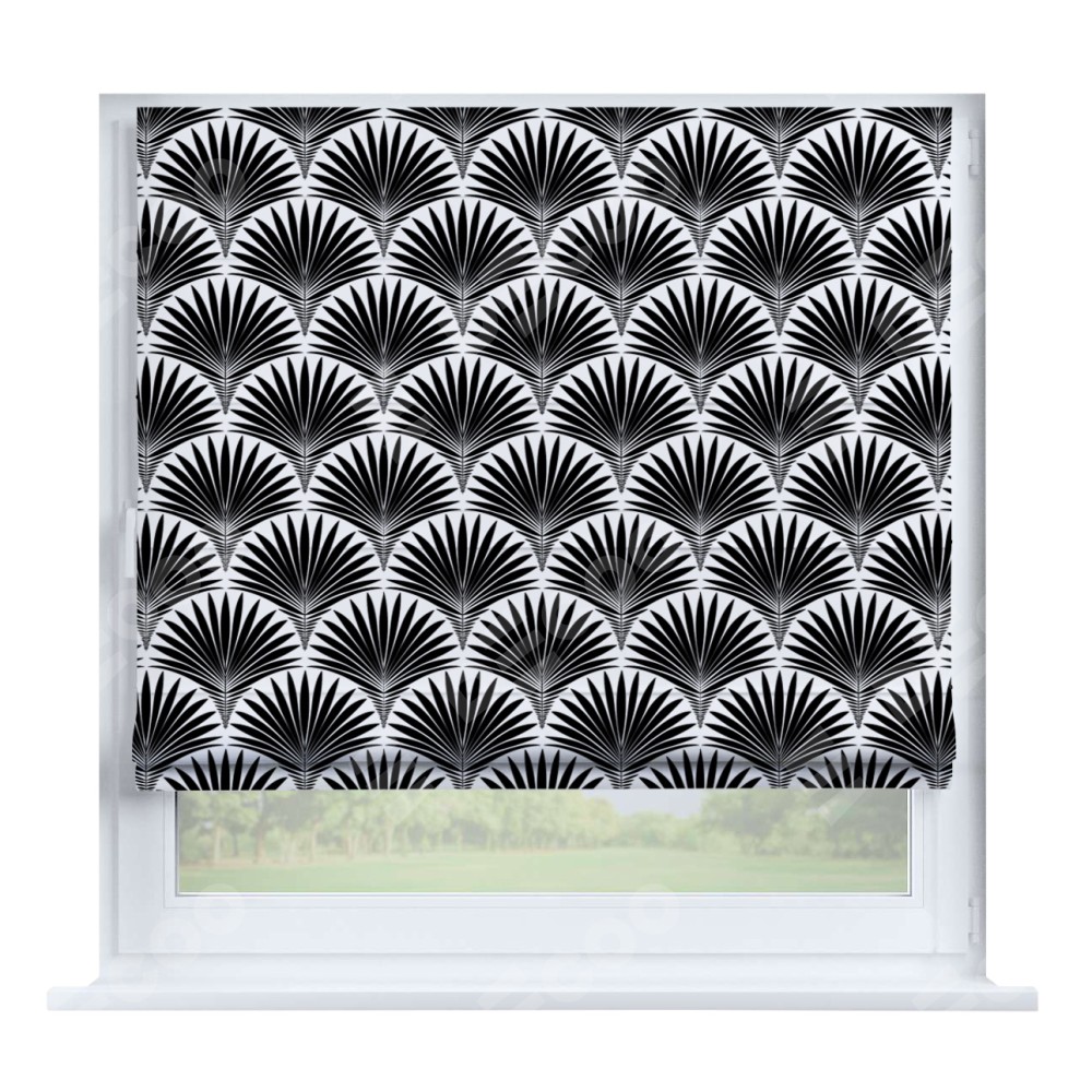 Римская штора производителя «Cortin», устанавливается на створку окна, пошита из ткани блэкаут с нанесением сублимационной печати «Арт-деко листья черный». Штора шьётся по индивидуальным размерам, для данного типа римской шторы возможная ширина от 35 до 150 см., высота до 250 см.