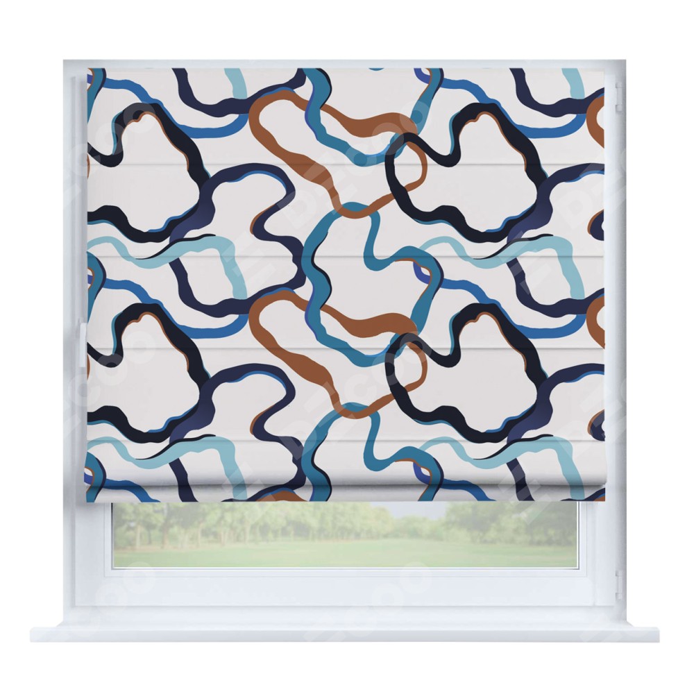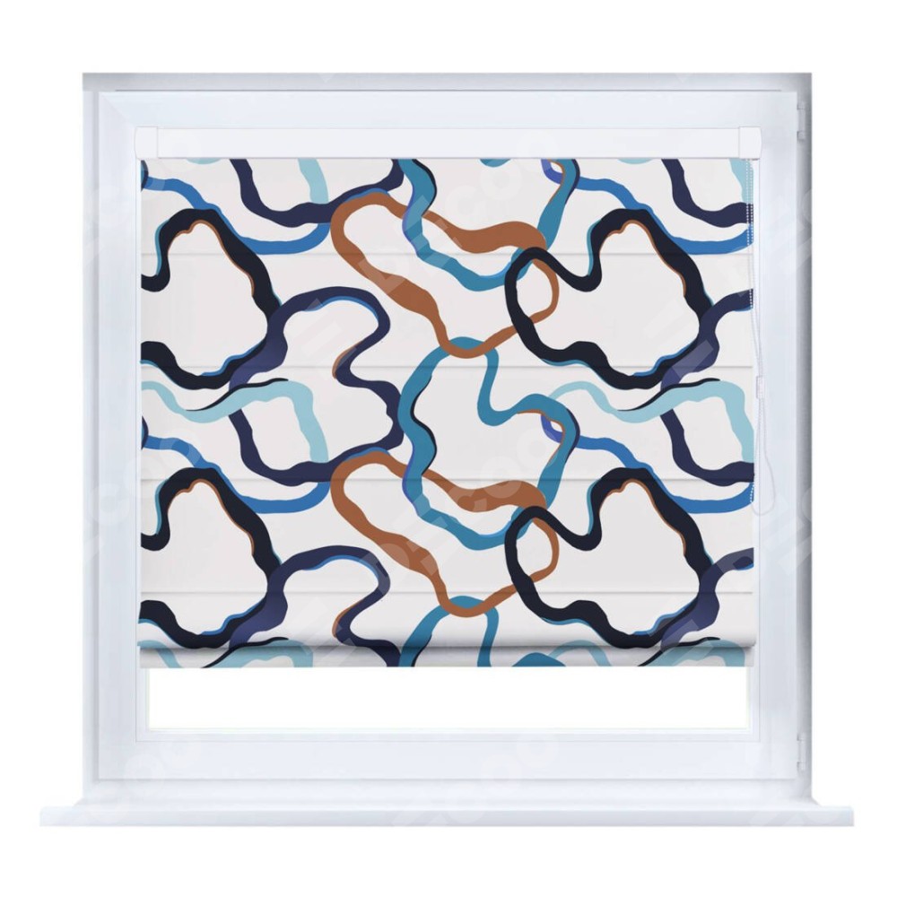 Римская штора производителя «Cortin», устанавливается на створку окна, пошита из ткани блэкаут с нанесением сублимационной печати «Волнистые ленты». Штора шьётся по индивидуальным размерам, для данного типа римской шторы возможная ширина от 35 до 150 см., высота до 250 см.