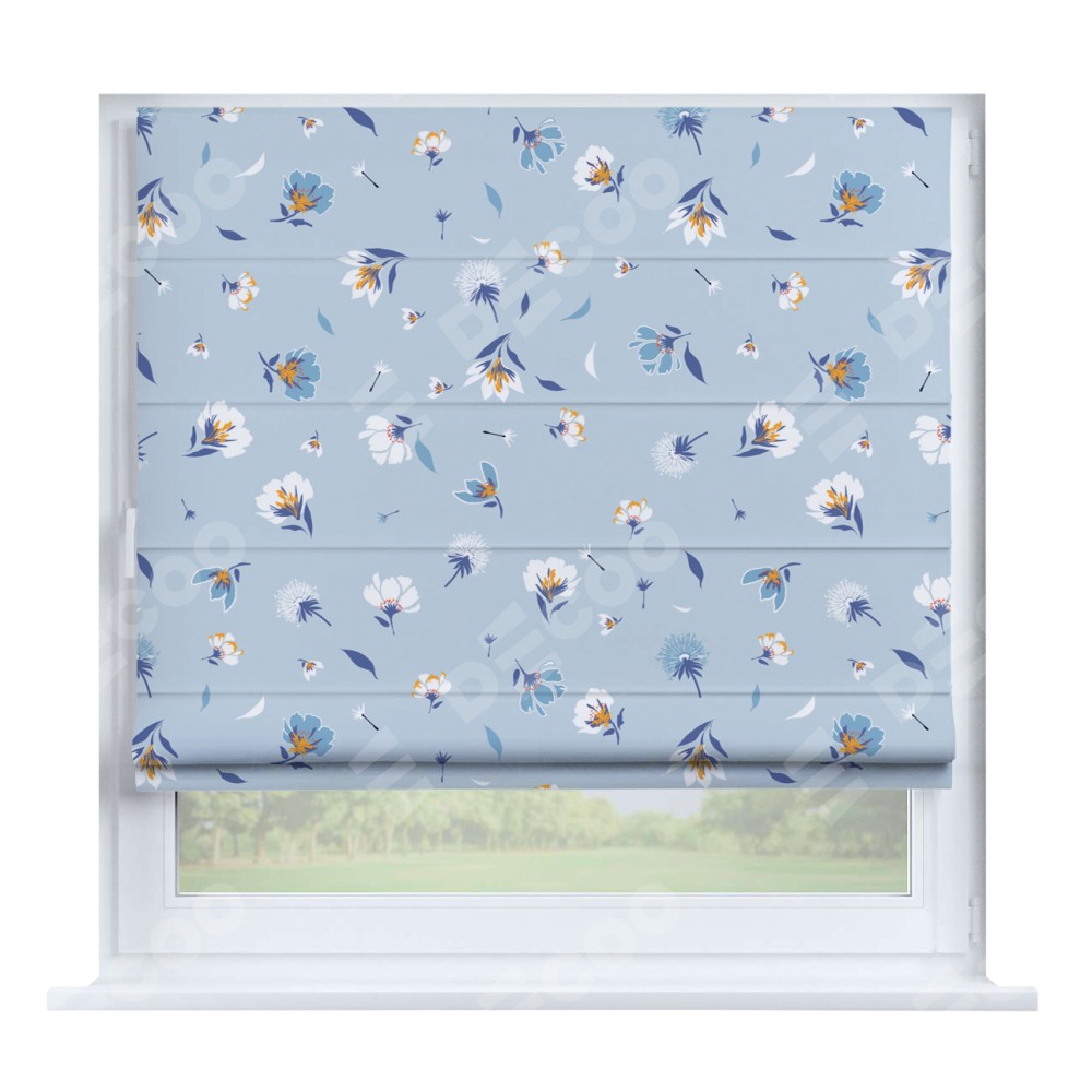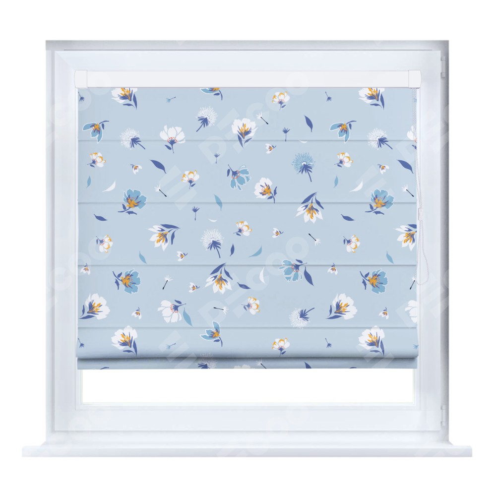Римская штора производителя «Cortin», устанавливается на створку окна, пошита из ткани блэкаут с нанесением сублимационной печати «Голубые цветы». Штора шьётся по индивидуальным размерам, для данного типа римской шторы возможная ширина от 35 до 150 см., высота до 250 см.