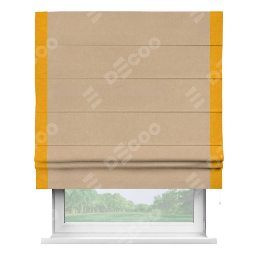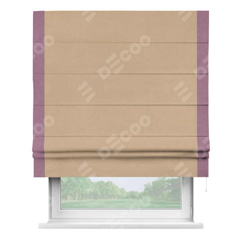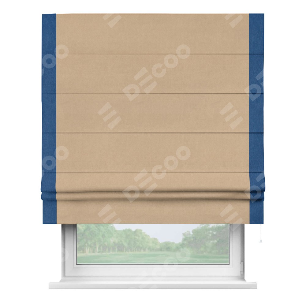 Римская штора производителя «Cortin», используется для проёма, пошита из ткани вельвет песочный, артикул ткани 17740. Отделка шторы кантом «Стрим Дуо», ткань для канта используется из вельвета разной расцветки на выбор. Имеет универсальный механизм и подходит для монтажа: на потолок, на стену и в нишу.