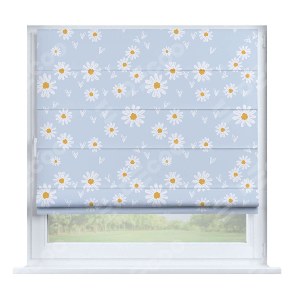 Римская штора производителя «Cortin», устанавливается на створку окна, пошита из ткани блэкаут с нанесением сублимационной печати «Летние ромашки». Штора шьётся по индивидуальным размерам, для данного типа римской шторы возможная ширина от 35 до 150 см., высота до 250 см.
