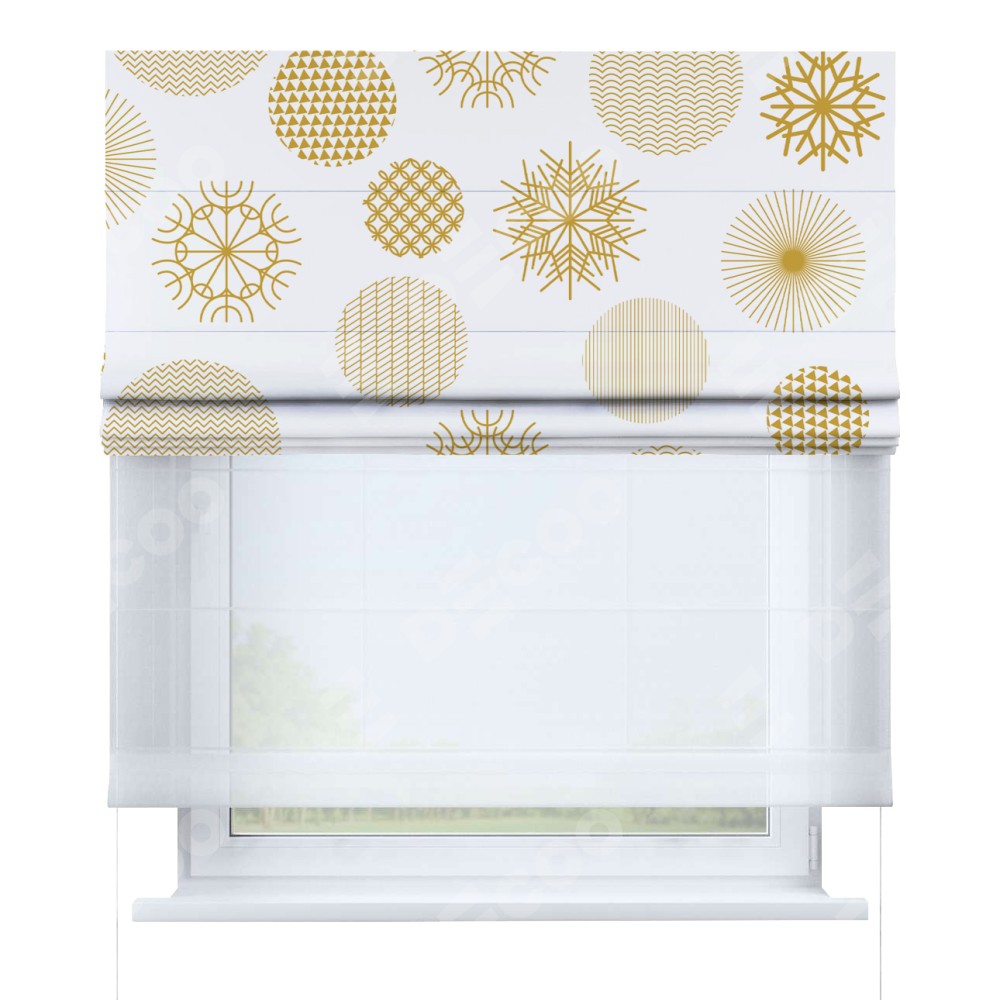 Римская штора день-ночь производителя «Cortin», используется для проёма, пошита из двух полотен, с лицевой блэкаут с нанесением сублимационной печати «Золотые шары», вторая ткань тюль (по стандарту комплектуется тюль белого цвета артикул V-01). Имеет универсальный механизм и подходит для монтажа: на потолок, на стену и в нишу.