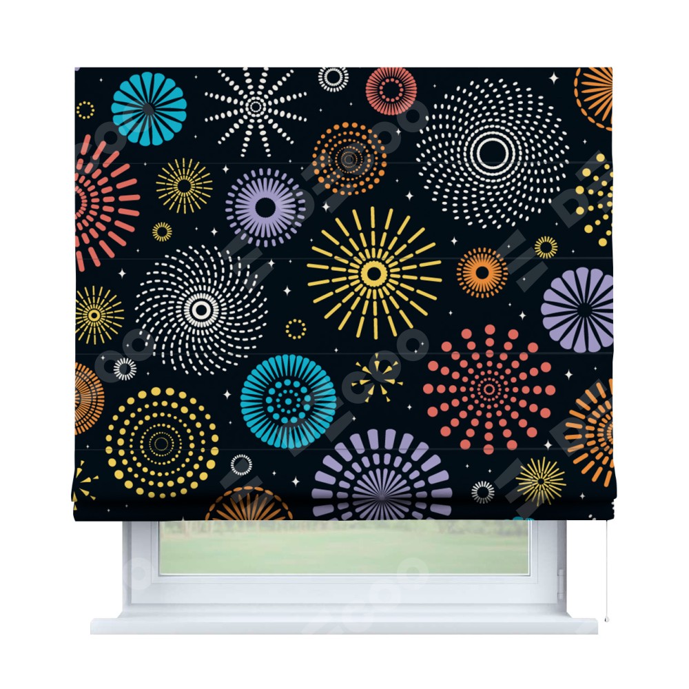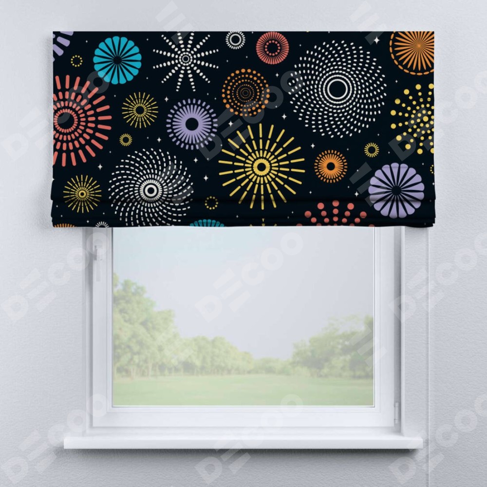 Римская штора производителя «Cortin», используется для проёма, пошита из ткани блэкаут с нанесением сублимационной печати «Праздничный фейерверк». Имеет универсальный механизм и подходит для монтажа: на потолок, на стену и в нишу.