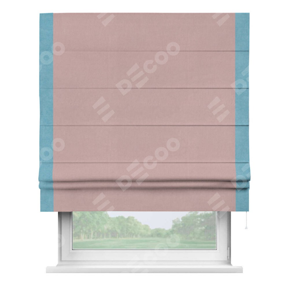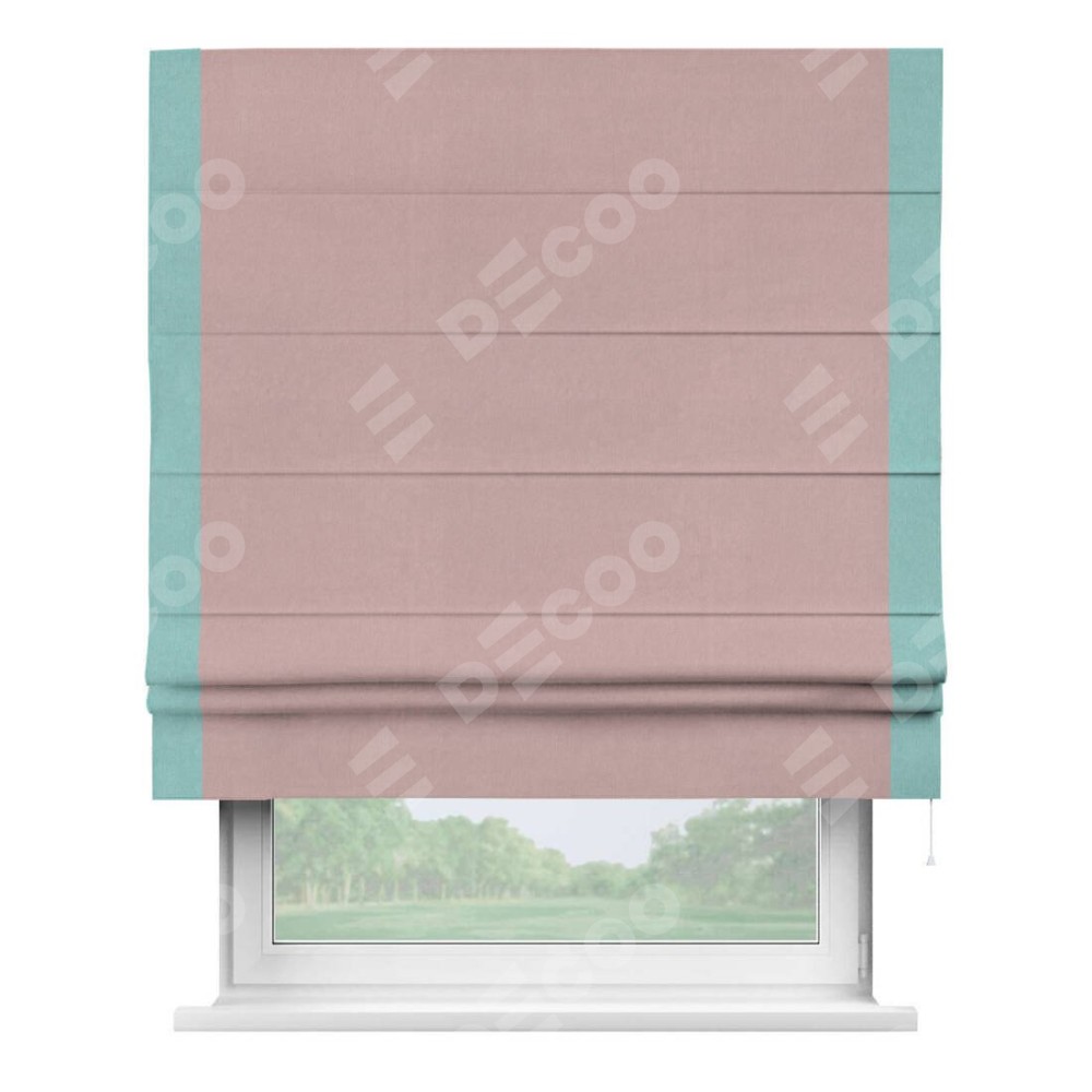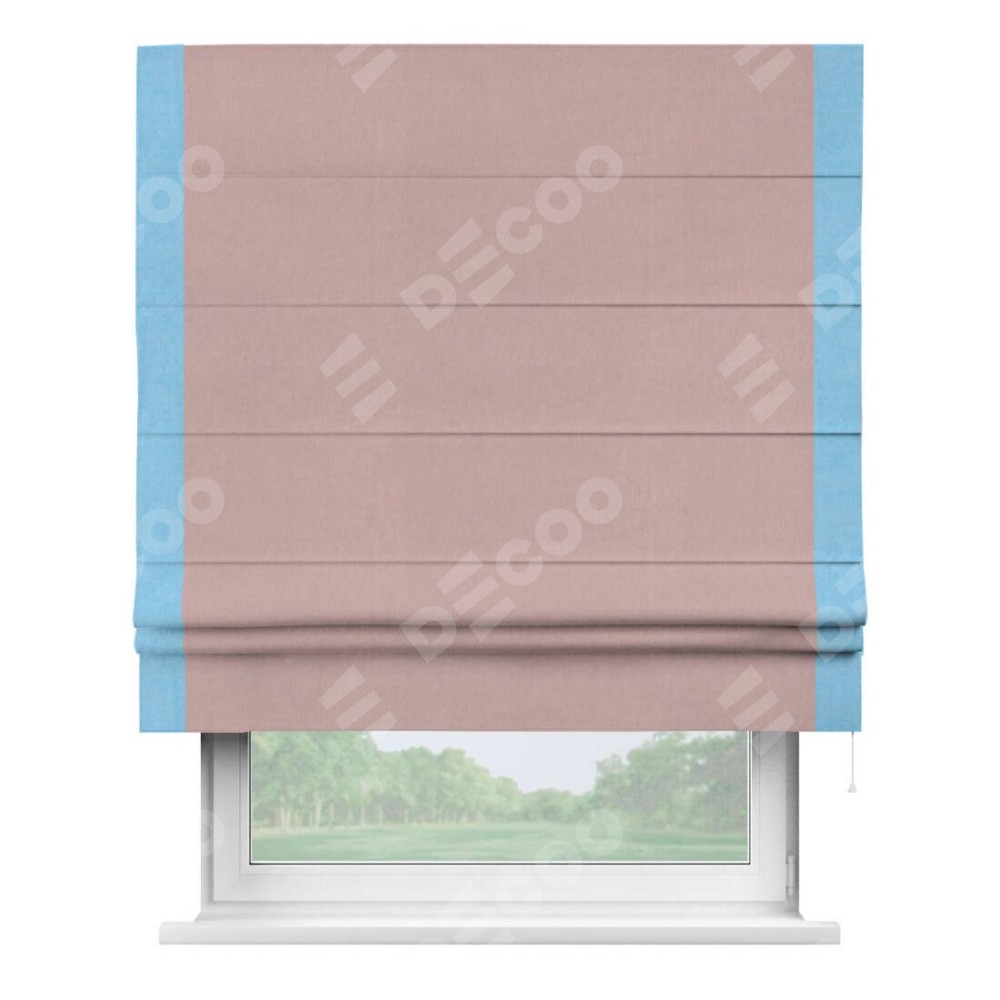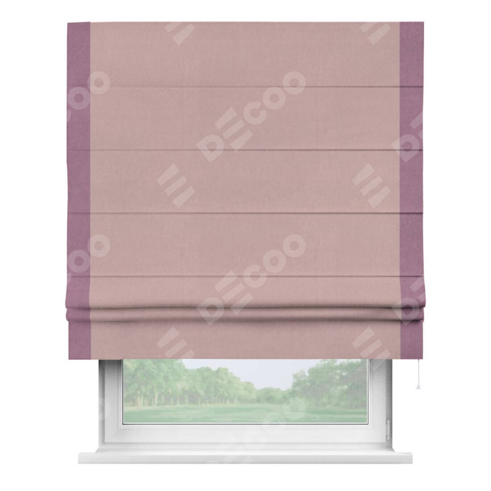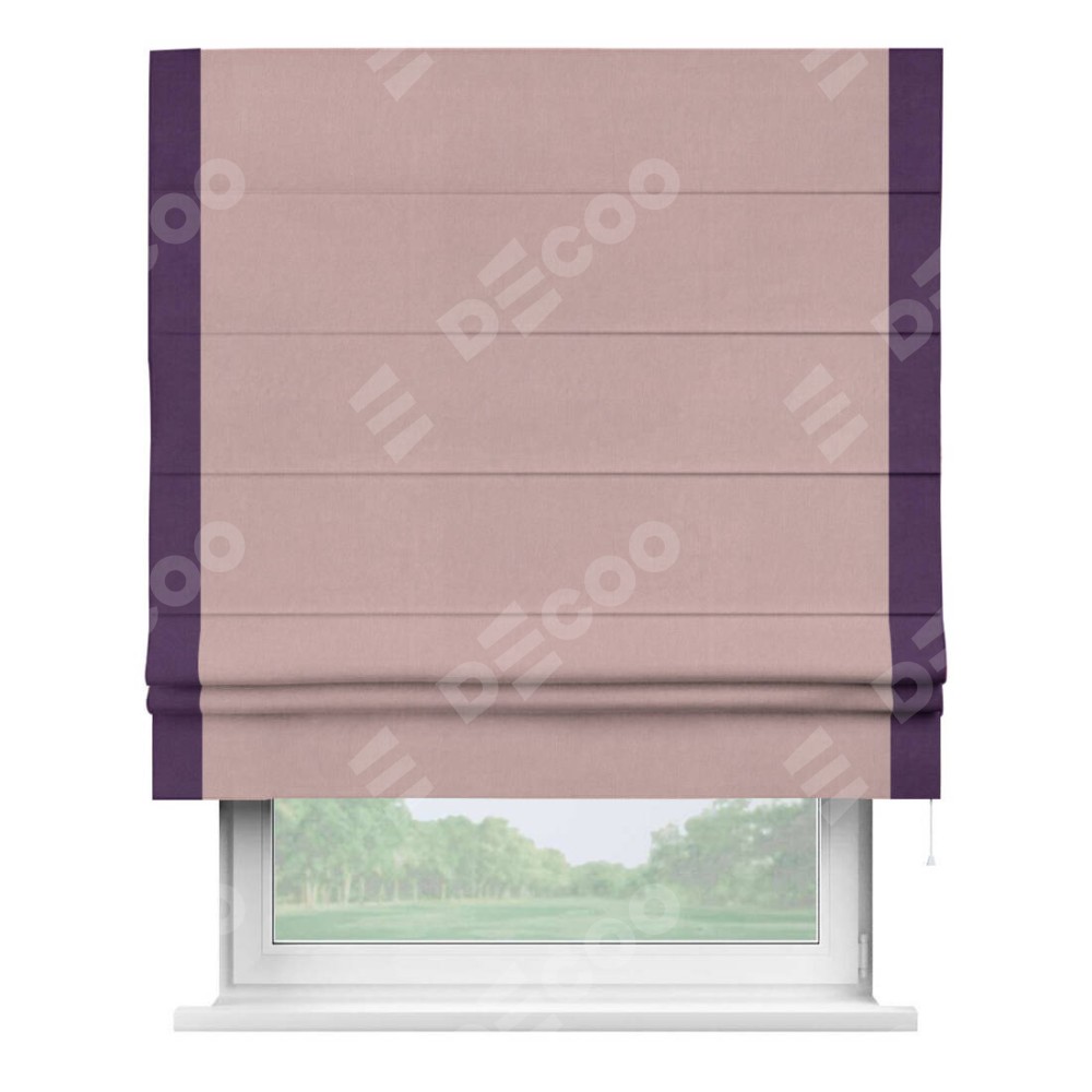 Римская штора производителя «Cortin», используется для проёма, пошита из ткани вельвет розовая пудра, артикул ткани 14132. Отделка шторы кантом «Стрим Дуо», ткань для канта используется из вельвета разной расцветки на выбор. Имеет универсальный механизм и подходит для монтажа: на потолок, на стену и в нишу.