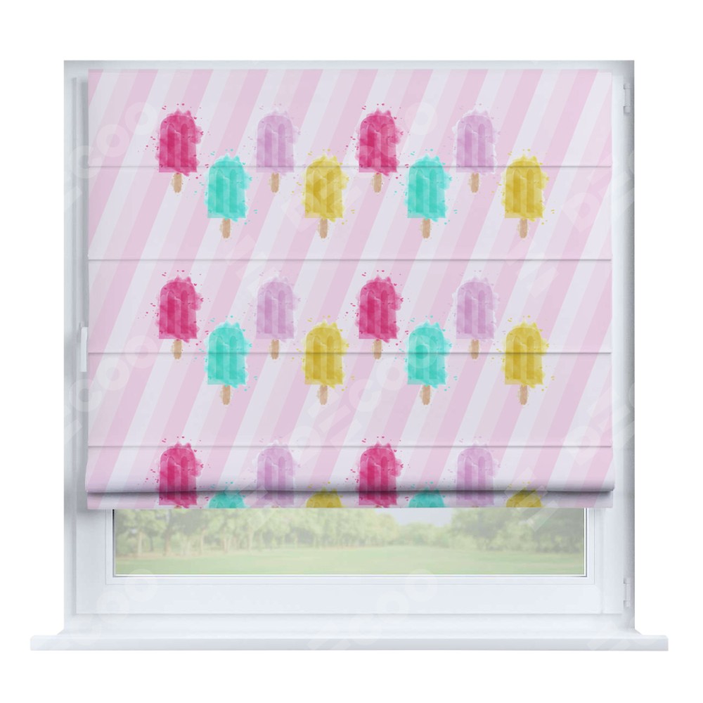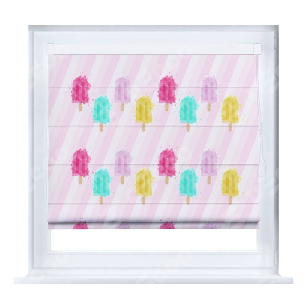 Римская штора производителя «Cortin», устанавливается на створку окна, пошита из ткани блэкаут с нанесением сублимационной печати «Фруктовое мороженое». Штора шьётся по индивидуальным размерам, для данного типа римской шторы возможная ширина от 35 до 150 см., высота до 250 см.