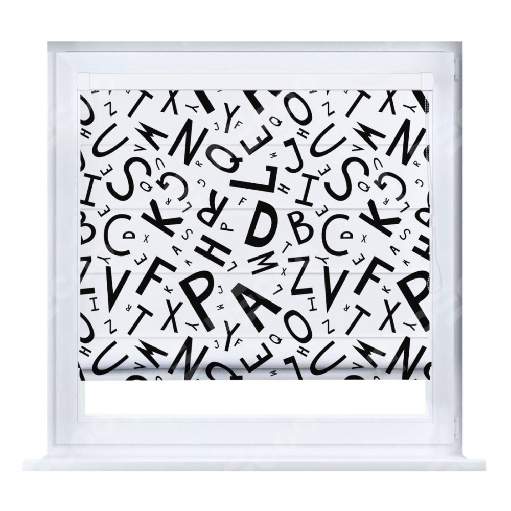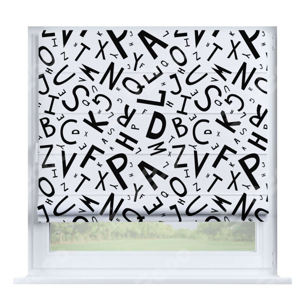 Римская штора производителя «Cortin», устанавливается на створку окна, пошита из ткани блэкаут с нанесением сублимационной печати «Литеры на белом». Штора шьётся по индивидуальным размерам, для данного типа римской шторы возможная ширина от 35 до 150 см., высота до 250 см.
