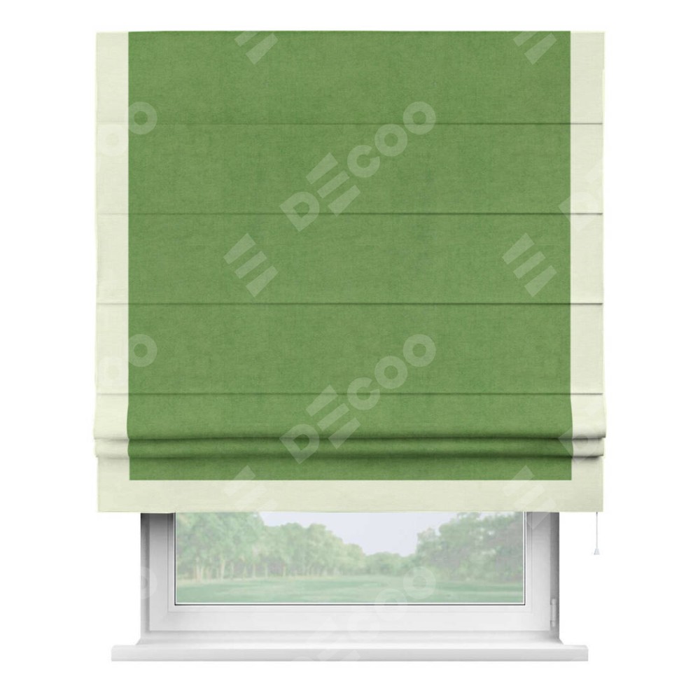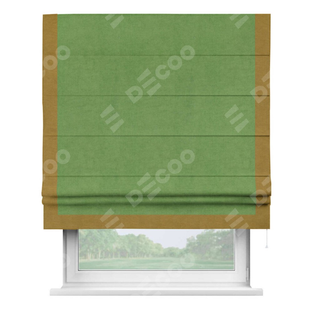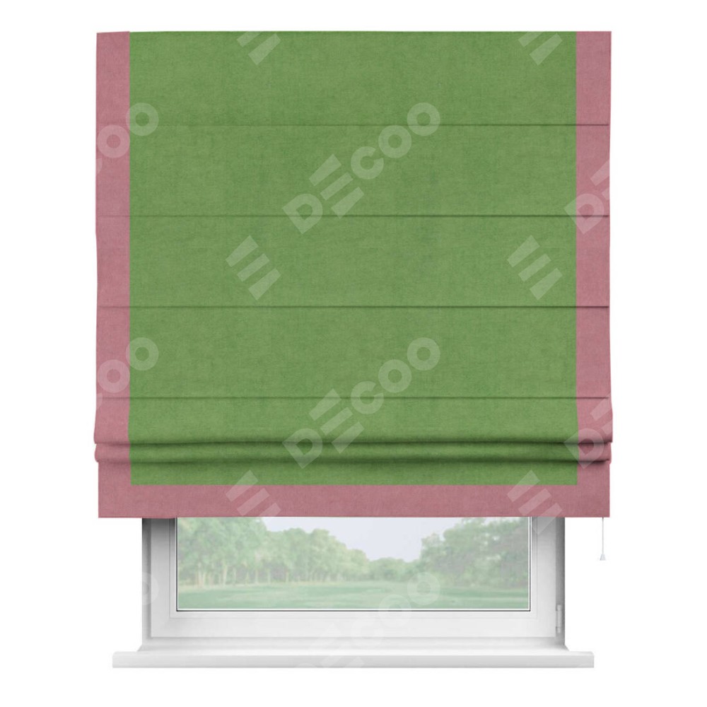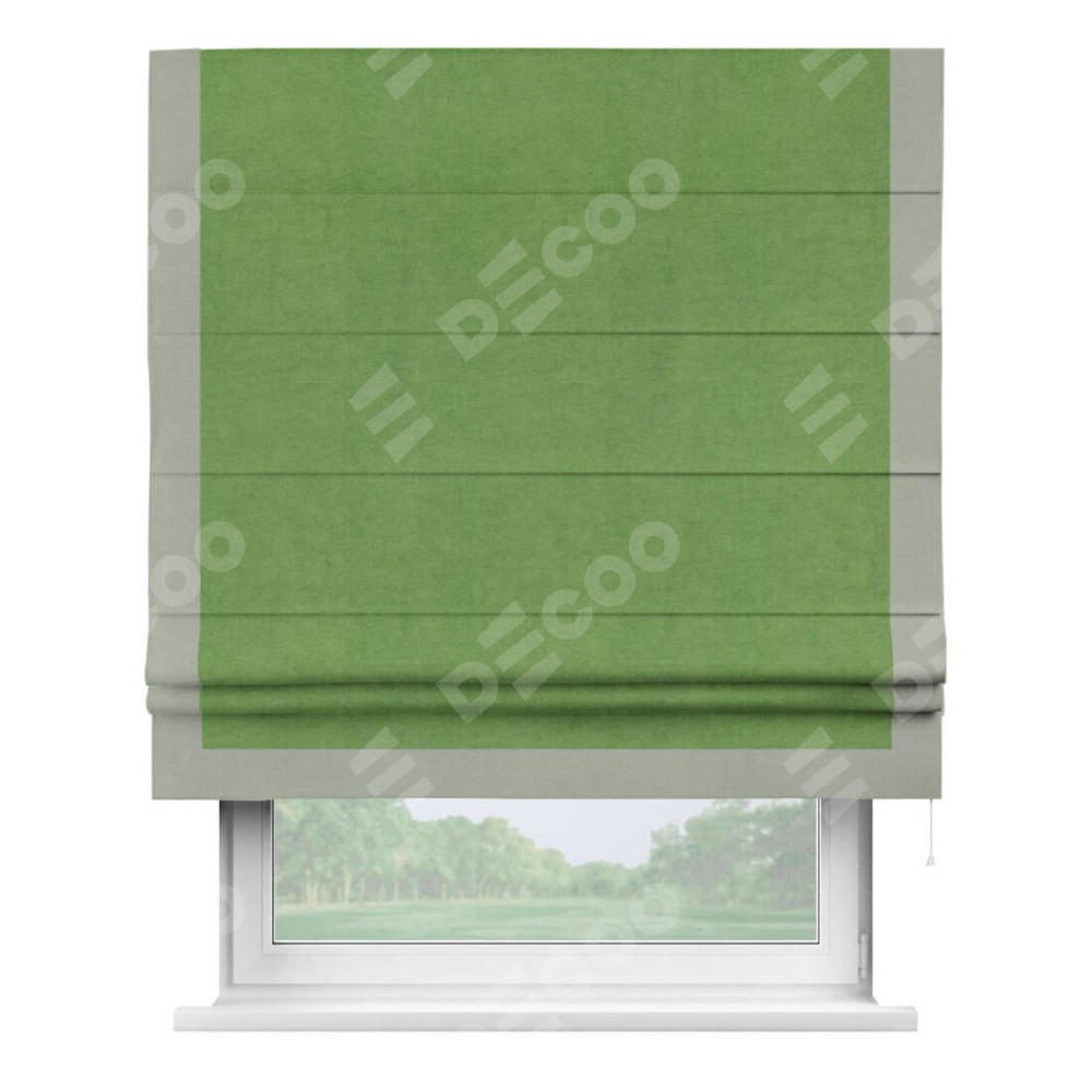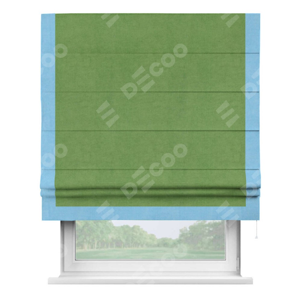 Римская штора производителя «Cortin», используется для проёма, пошита из ткани вельвет салатовый, артикул ткани 87072. Отделка шторы кантом «Виктория», ткань для канта используется из вельвета разной расцветки на выбор. Имеет универсальный механизм и подходит для монтажа: на потолок, на стену и в нишу.