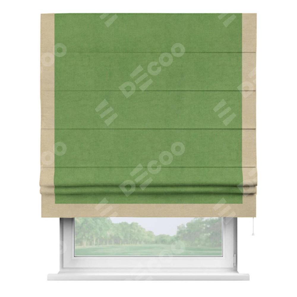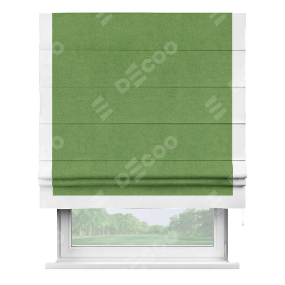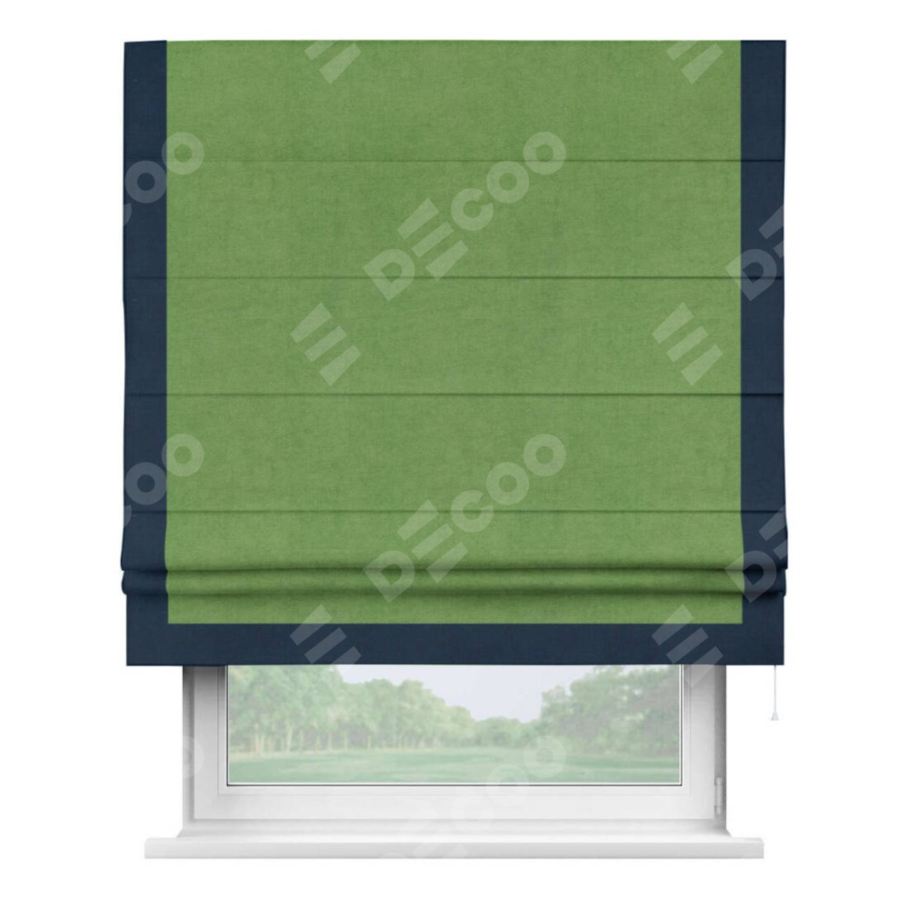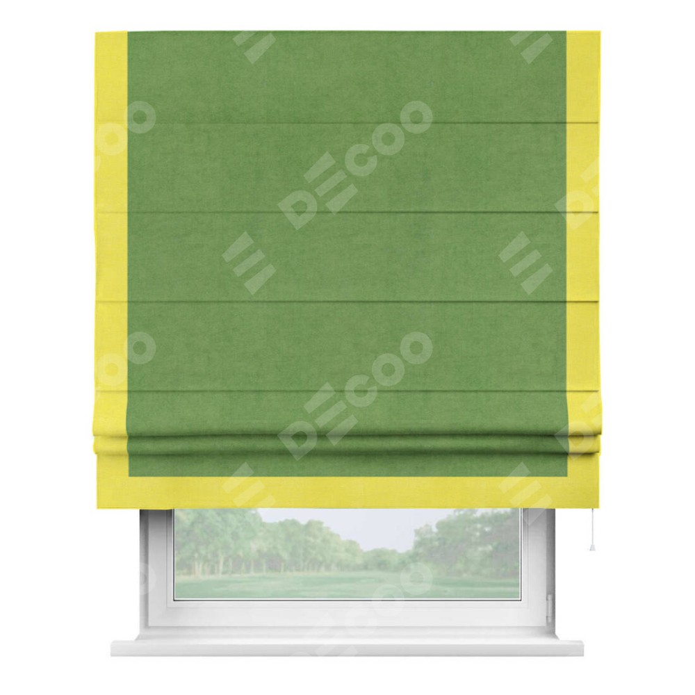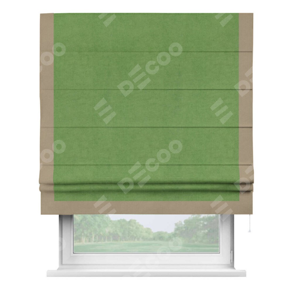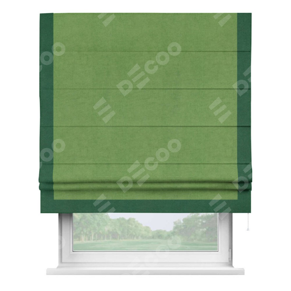 Римская штора производителя «Cortin», используется для проёма, пошита из ткани вельвет салатовый, артикул ткани 87072. Отделка шторы кантом «Виктория», ткань для канта используется из вельвета разной расцветки на выбор. Имеет универсальный механизм и подходит для монтажа: на потолок, на стену и в нишу.