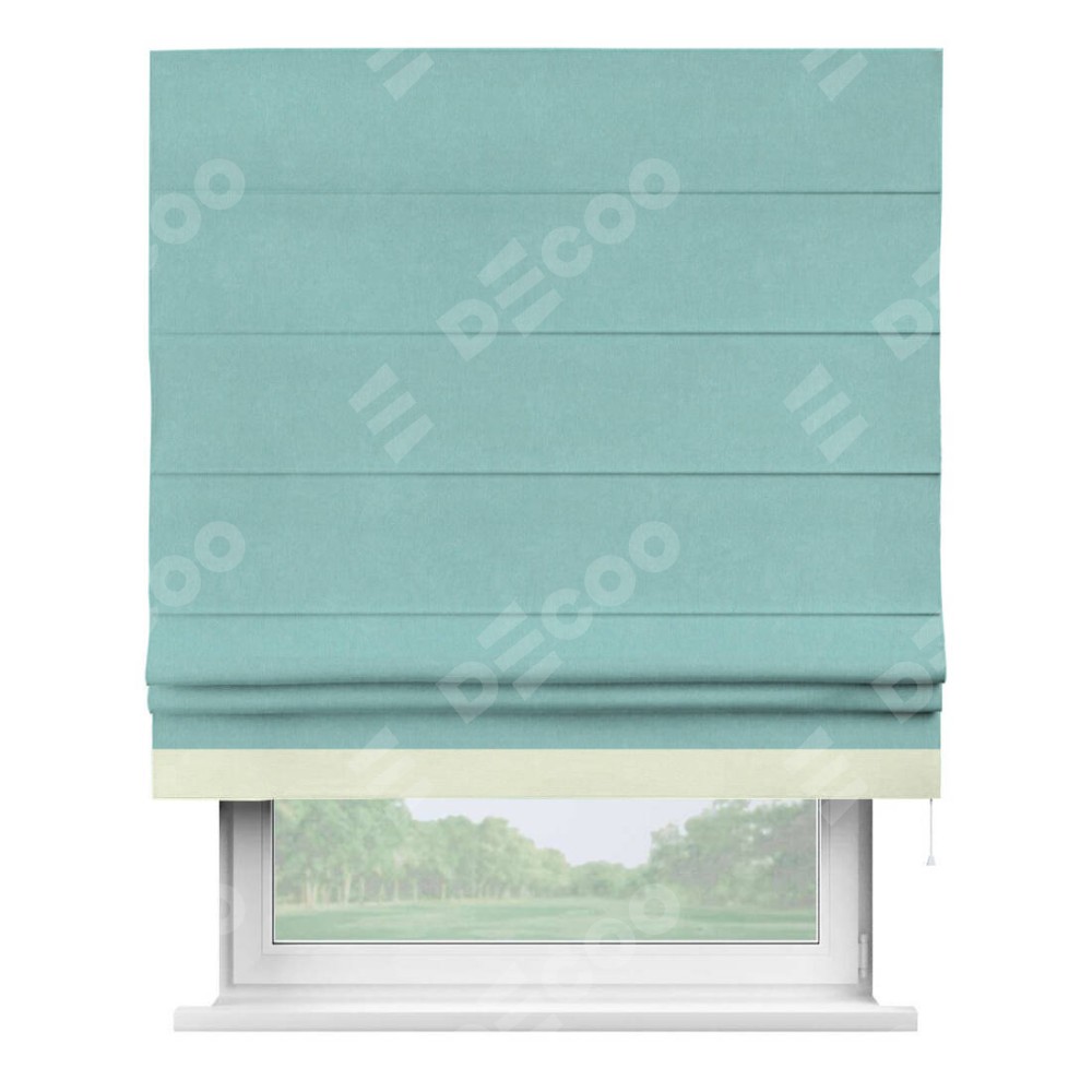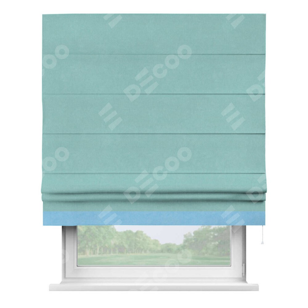Римская штора производителя «Cortin», используется для проёма, пошита из ткани вельвет тиффани, артикул ткани 17765. Отделка шторы кантом «Джестер», ткань для канта используется из вельвета разной расцветки на выбор. Имеет универсальный механизм и подходит для монтажа: на потолок, на стену и в нишу.