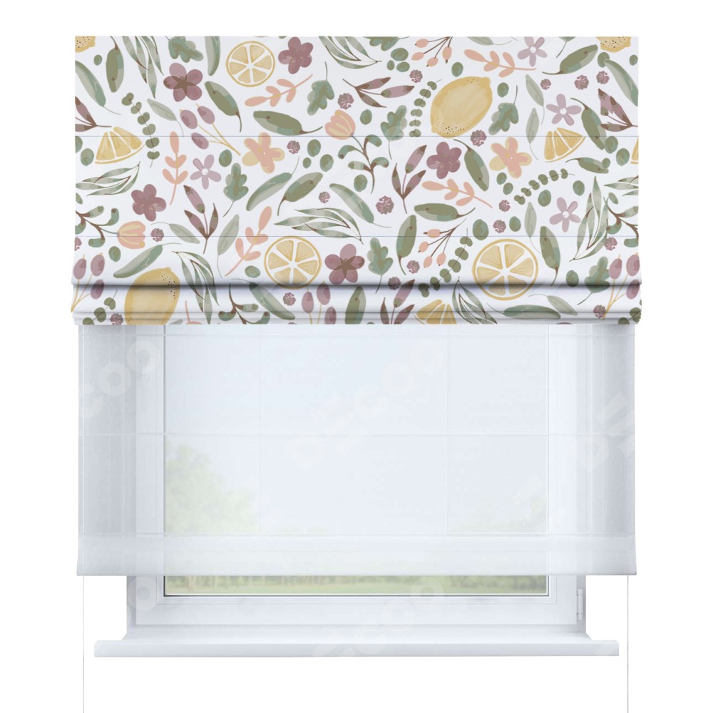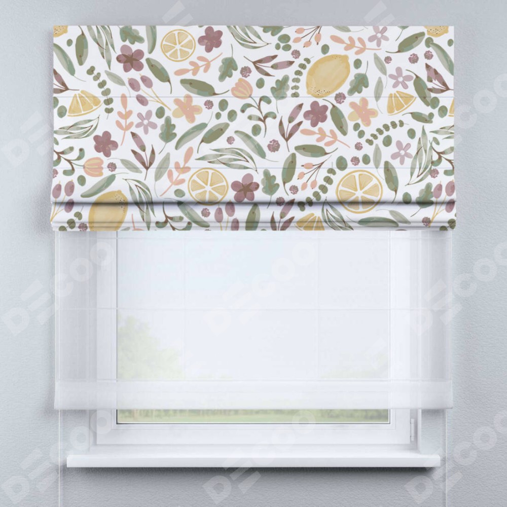 Римская штора день-ночь производителя «Cortin», используется для проёма, пошита из двух полотен, с лицевой блэкаут с нанесением сублимационной печати «Лимоны и цветы», вторая ткань тюль (по стандарту комплектуется тюль белого цвета артикул V-01). Имеет универсальный механизм и подходит для монтажа: на потолок, на стену и в нишу.