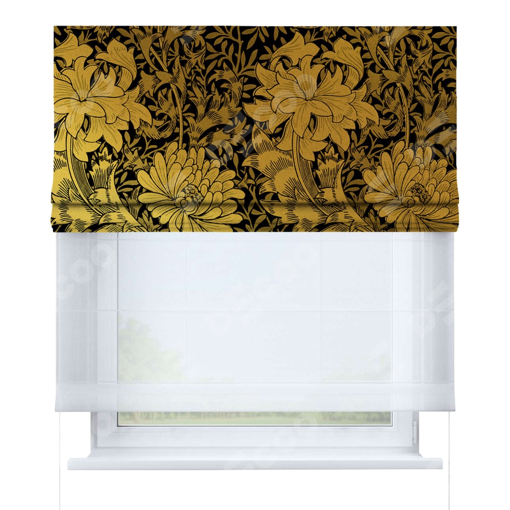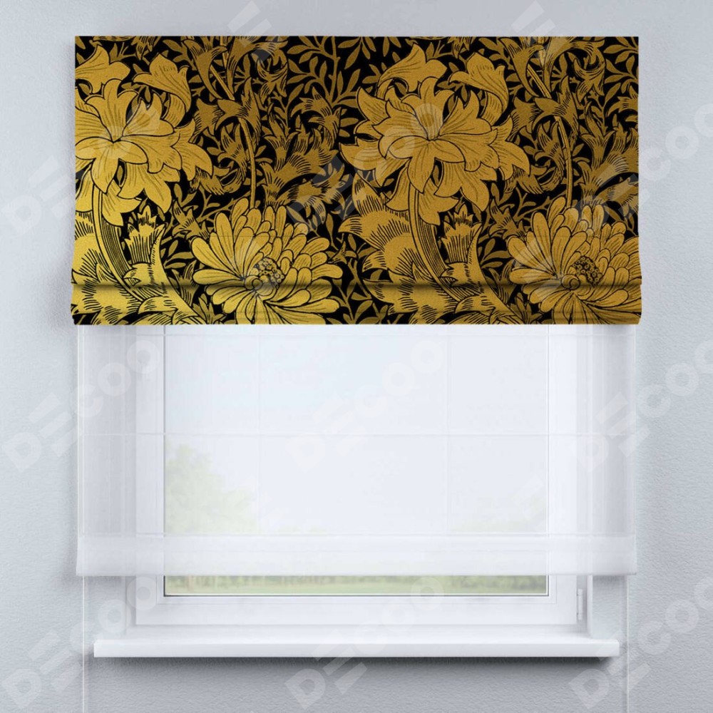 Римская штора день-ночь производителя «Cortin», используется для проёма, пошита из двух полотен, с лицевой блэкаут с нанесением сублимационной печати «Ремикс морриса», вторая ткань тюль (по стандарту комплектуется тюль белого цвета артикул V-01). Имеет универсальный механизм и подходит для монтажа: на потолок, на стену и в нишу.