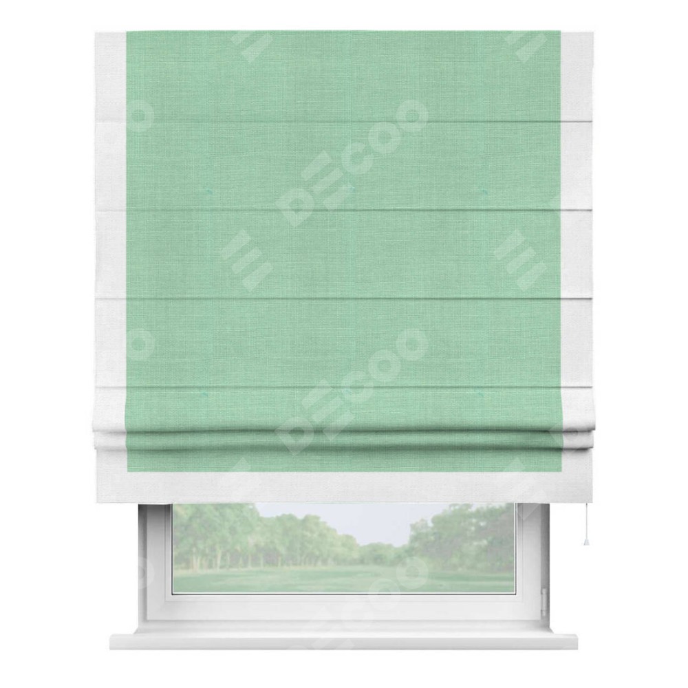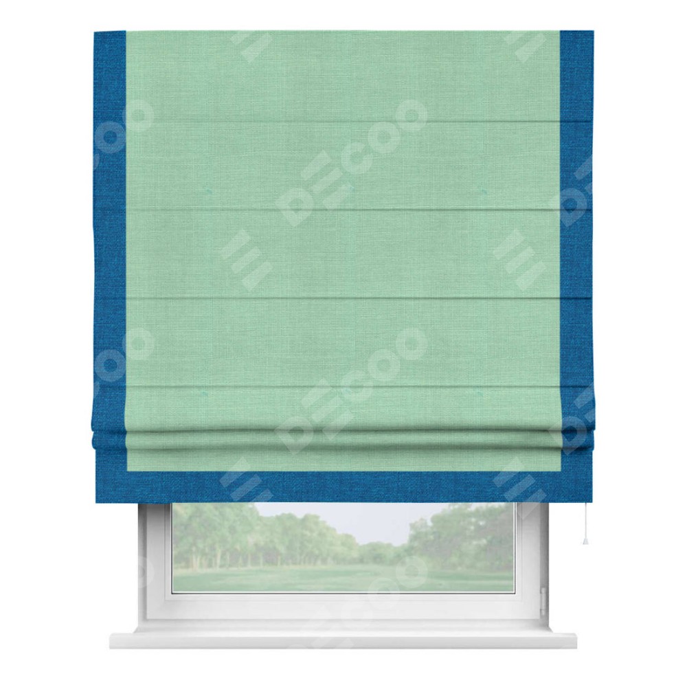 Римская штора производителя «Cortin», используется для проёма, пошита из ткани лён светло-бирюзовый, артикул 74737. Отделка шторы кантом «Виктория», ткань для канта используется из льна разной расцветки на выбор. Имеет универсальный механизм и подходит для монтажа: на потолок, на стену и в нишу.