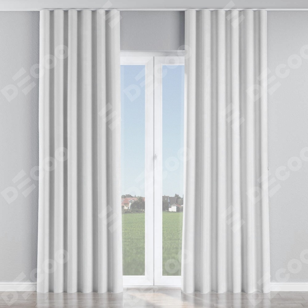 Комплект прямых штор, от производителя «Cortin», пошиты из ткани вельвет белоснежный, артикул ткани 19192. С изнаночной стороны в верхней части штор пристрачивается шторная лента с декоративными складками «Волна». Для создания элегантных складок прямые шторы шьются по стандарту с коэффициентом 1:2 (на 100 см. ширины проёма 200 см. ширины ткани).