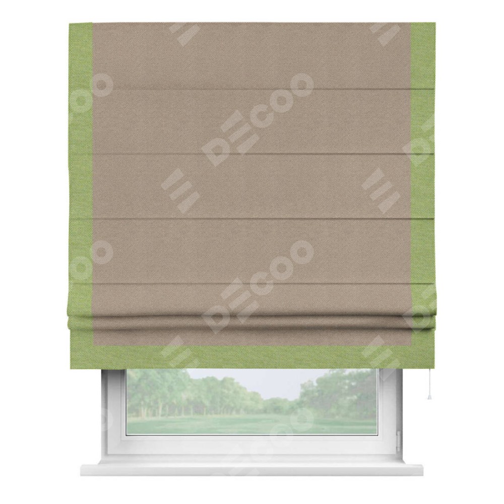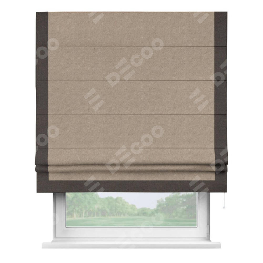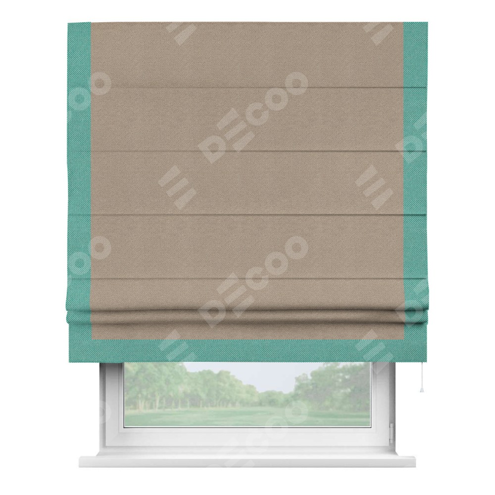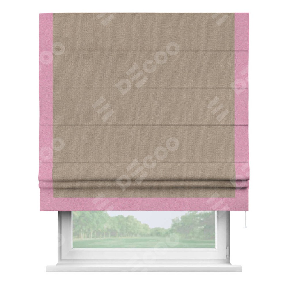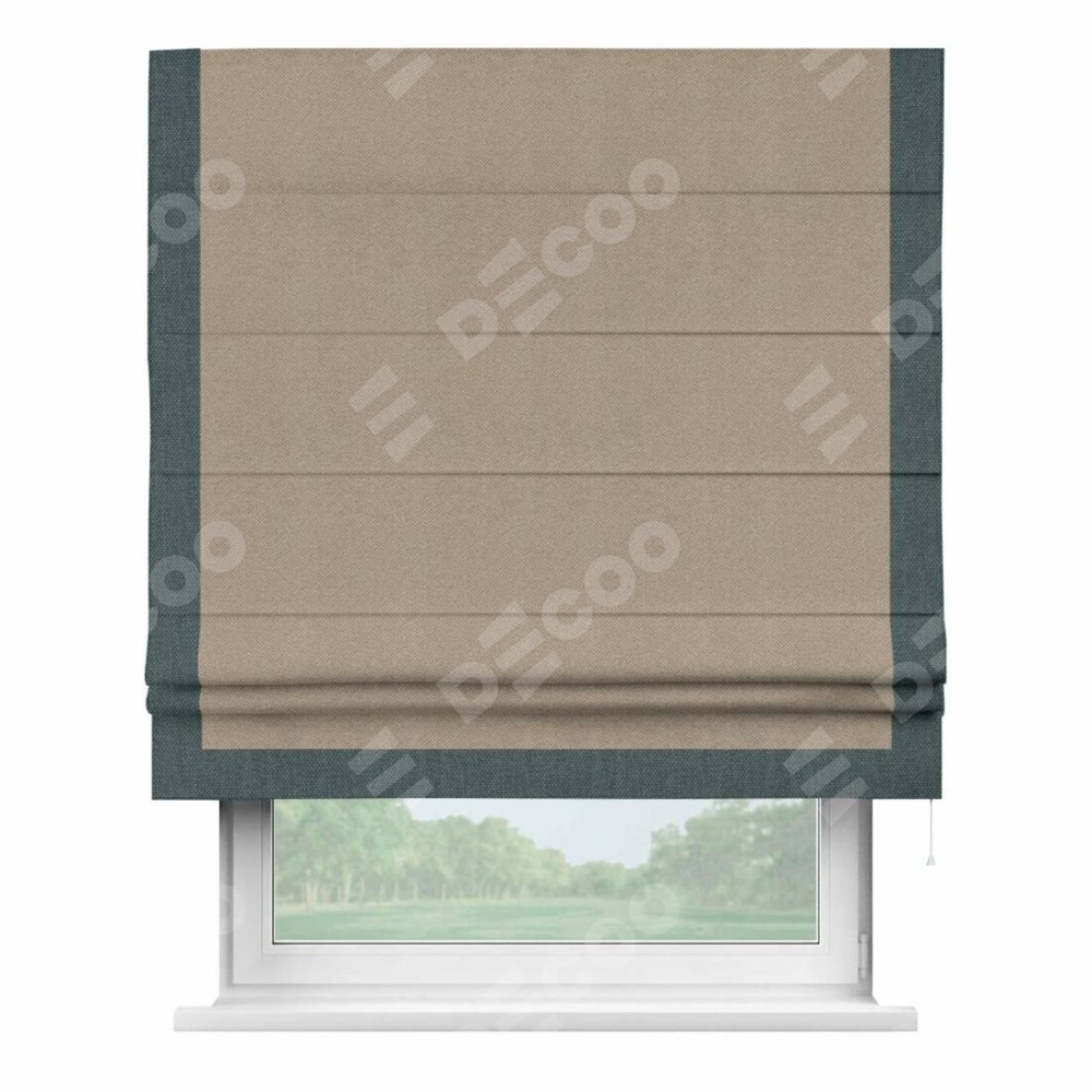 Римская штора производителя «Cortin», используется для проёма, пошита из ткани лён димаут светло-бежевый, артикул 00002. Отделка шторы кантом «Виктория», ткань для канта используется из льна димаут разной расцветки на выбор. Имеет универсальный механизм и подходит для монтажа: на потолок, на стену и в нишу.