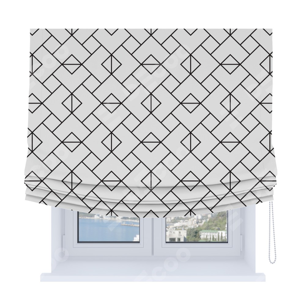 Римская штора Soft производителя «Cortin», используется для проёма, пошита из ткани блэкаут с нанесением сублимационной печати «Геометрический орнамент». Имеет универсальный механизм и подходит для монтажа: на потолок, на стену и в нишу. В отличие от стандартных римских штор, римская штора Soft не имеет горизонтальных вставок и нижнего отвеса. Это позволяет ткани произвольно драпироваться в свободные мягкие складки.