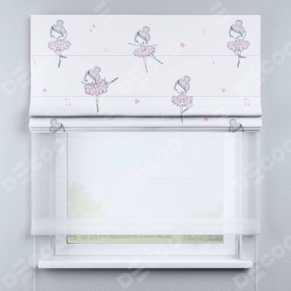 Римская штора день-ночь производителя «Cortin», используется для проёма, пошита из двух полотен, с лицевой блэкаут с нанесением сублимационной печати «Маленькая балерина», вторая ткань тюль (по стандарту комплектуется тюль белого цвета артикул V-01). Имеет универсальный механизм и подходит для монтажа: на потолок, на стену и в нишу.