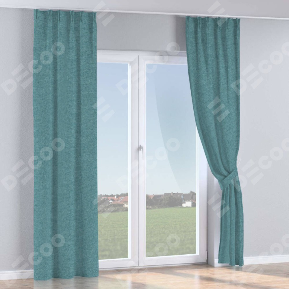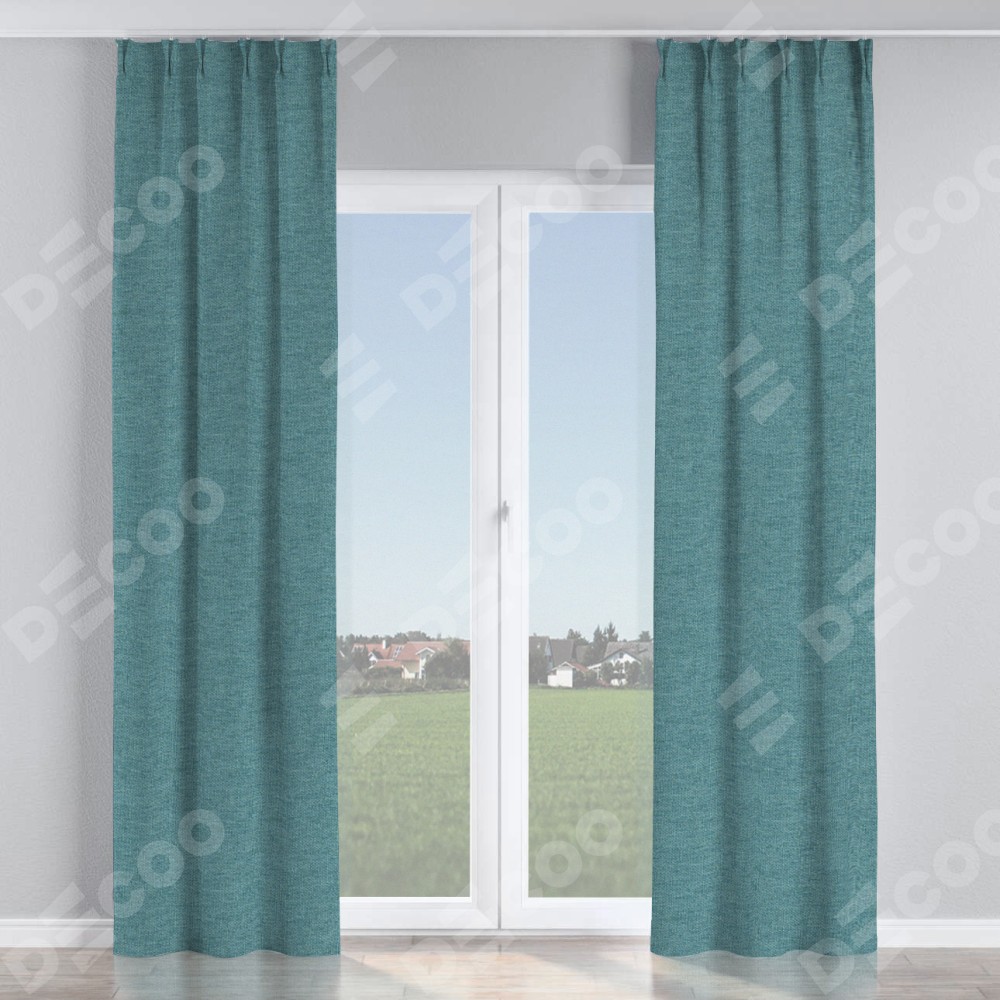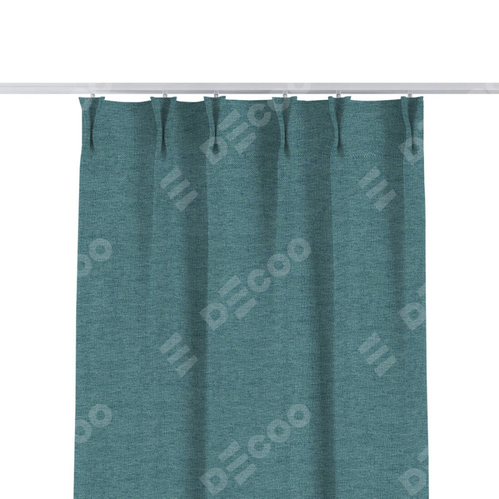 Комплект прямых штор, от производителя «Cortin», пошиты из ткани стиф димаут бирюзовый, артикул ткани 18196. С изнаночной стороны в верхней части штор пристрачивается шторная лента с декоративными складками «Кустик». Для создания элегантных складок прямые шторы шьются по стандарту с коэффициентом 1:2 (на 100 см. ширины проёма 200 см. ширины ткани).