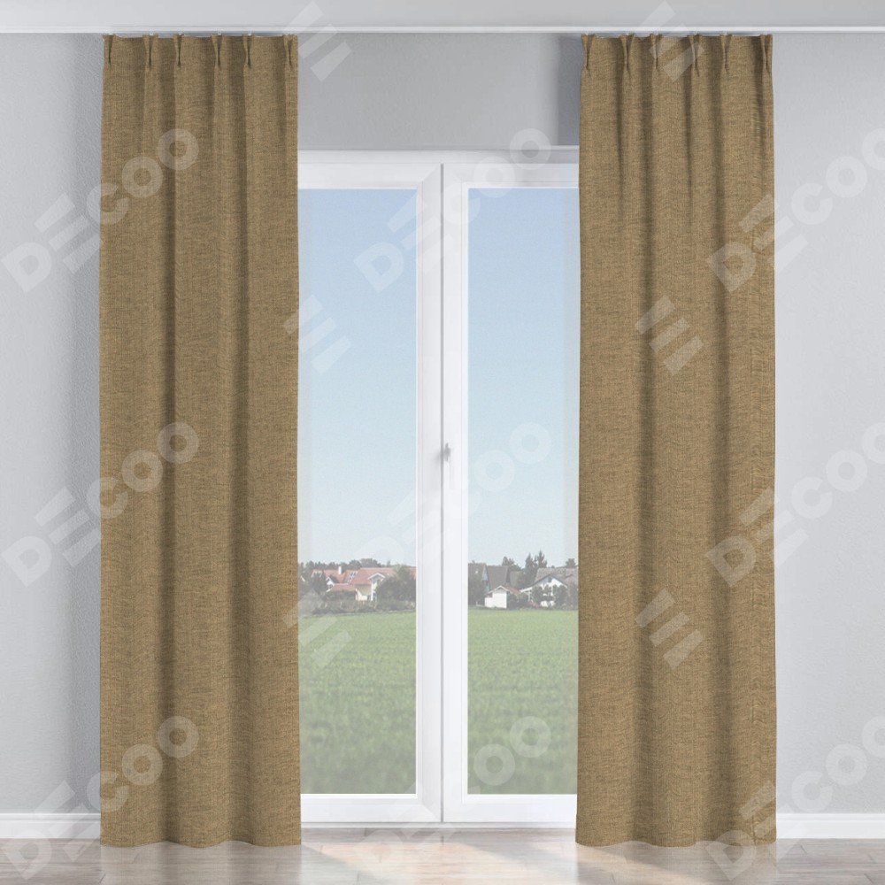 Комплект прямых штор, от производителя «Cortin», пошиты из ткани стиф димаут тёмно-бежевый, артикул ткани 18085. С изнаночной стороны в верхней части штор пристрачивается шторная лента с декоративными складками «Кустик». Для создания элегантных складок прямые шторы шьются по стандарту с коэффициентом 1:2 (на 100 см. ширины проёма 200 см. ширины ткани).