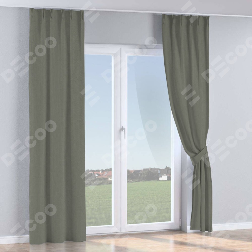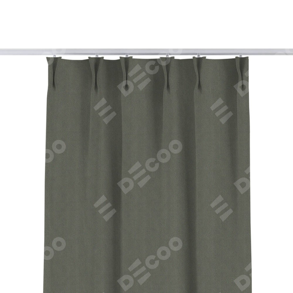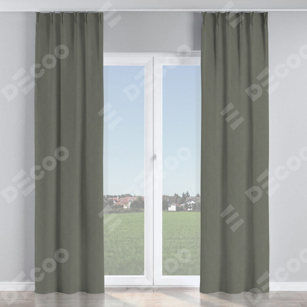 Комплект прямых штор, от производителя «Cortin», пошиты из ткани блэкаут однотонный тёмно-серый, артикул ткани 29332−1. С изнаночной стороны в верхней части штор пристрачивается шторная лента с декоративными складками «Кустик». Для создания элегантных складок прямые шторы шьются по стандарту с коэффициентом 1:2 (на 100 см. ширины проёма 200 см. ширины ткани).