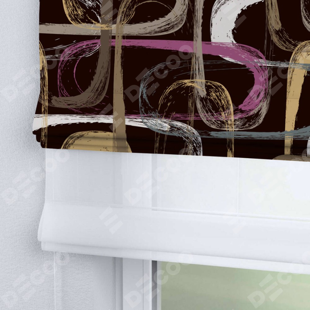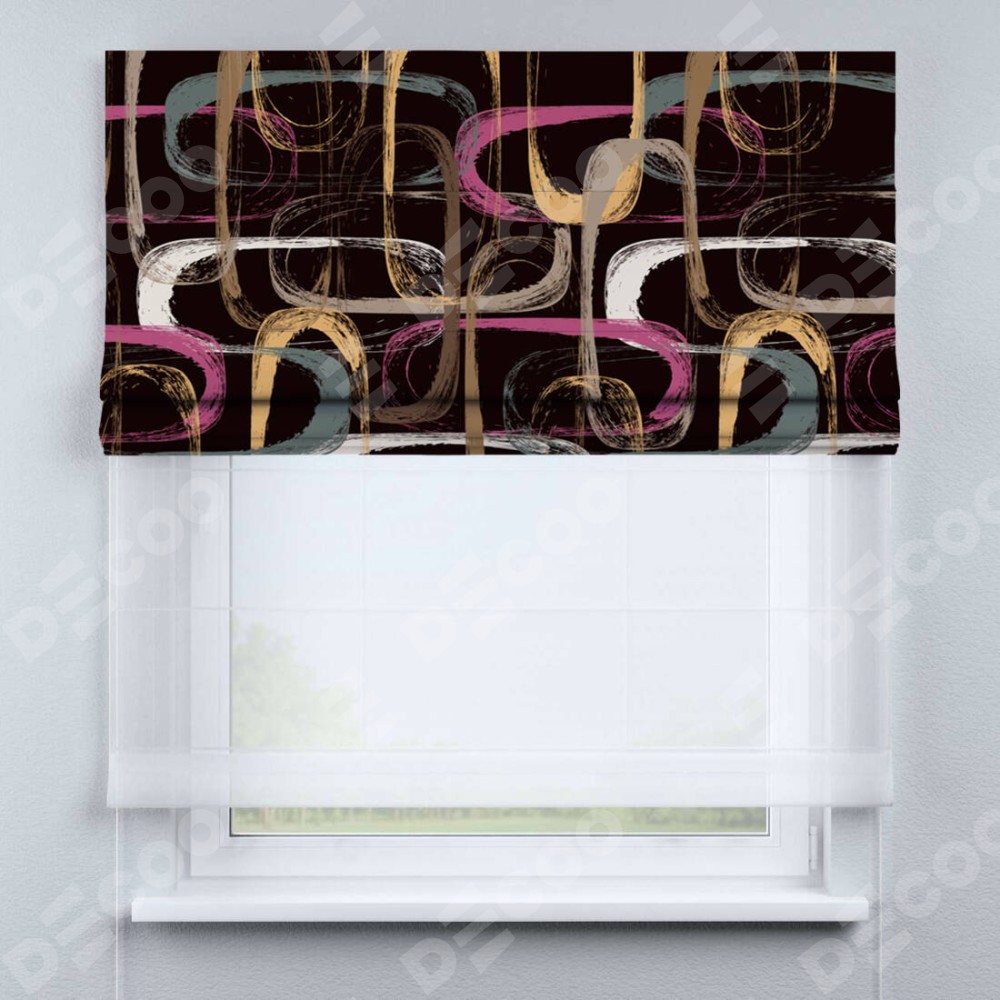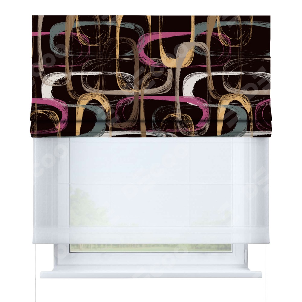Римская штора день-ночь производителя «Cortin», используется для проёма, пошита из двух полотен, с лицевой блэкаут с нанесением сублимационной печати «Тёмная палитра», вторая ткань тюль (по стандарту комплектуется тюль белого цвета артикул V-01). Имеет универсальный механизм и подходит для монтажа: на потолок, на стену и в нишу.