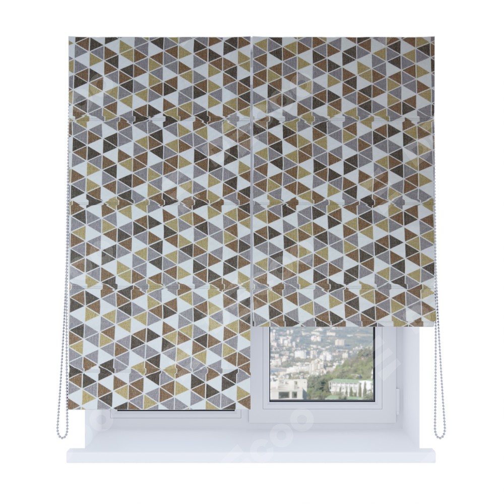 Римская штора «Кортин», система «Комфорт», димаут «Треугольники коричневые» доступна к заказу по индивидуальным размерам. Рабочий артикул: 23325. Стоимость пошива будет зависеть от выбранных опций и начинается от 7 266 руб. В интернет-магазине Decoo вы сможете заказать товар в любых вариациях.