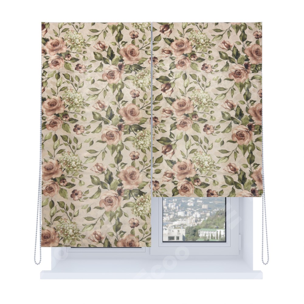 Римская штора производителя «Cortin», используется для проёма, пошита из ткани «Розы бежевые», артикул ткани 34564. Имеет универсальный механизм и подходит для монтажа: на потолок, на стену и в нишу. Удобное управление каждой шторой отдельно.