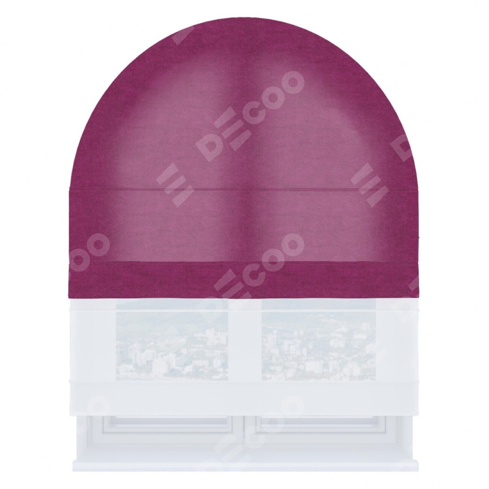 Римская штора день-ночь производителя «Cortin», используется для арочного проёма, пошита из двух полотен, с лицевой стороны вельвет фиолетовый артикул 85552, вторая ткань тюль (по стандарту комплектуется тюль белого цвета артикул V-01). Штора шьётся по индивидуальным размерам, для данного типа римской шторы возможная ширина от 60 до 300 см. Удобное управление каждой шторой отдельно.