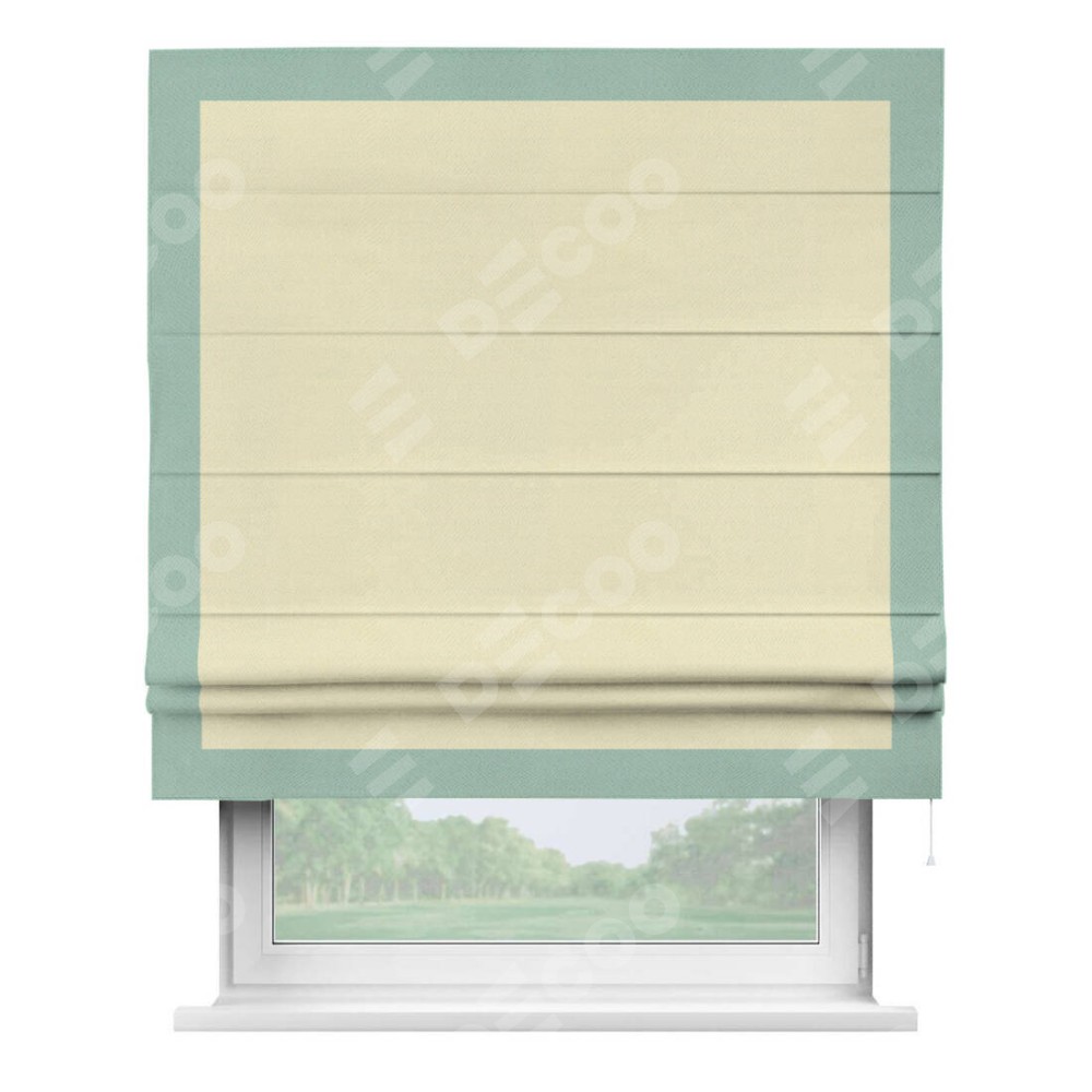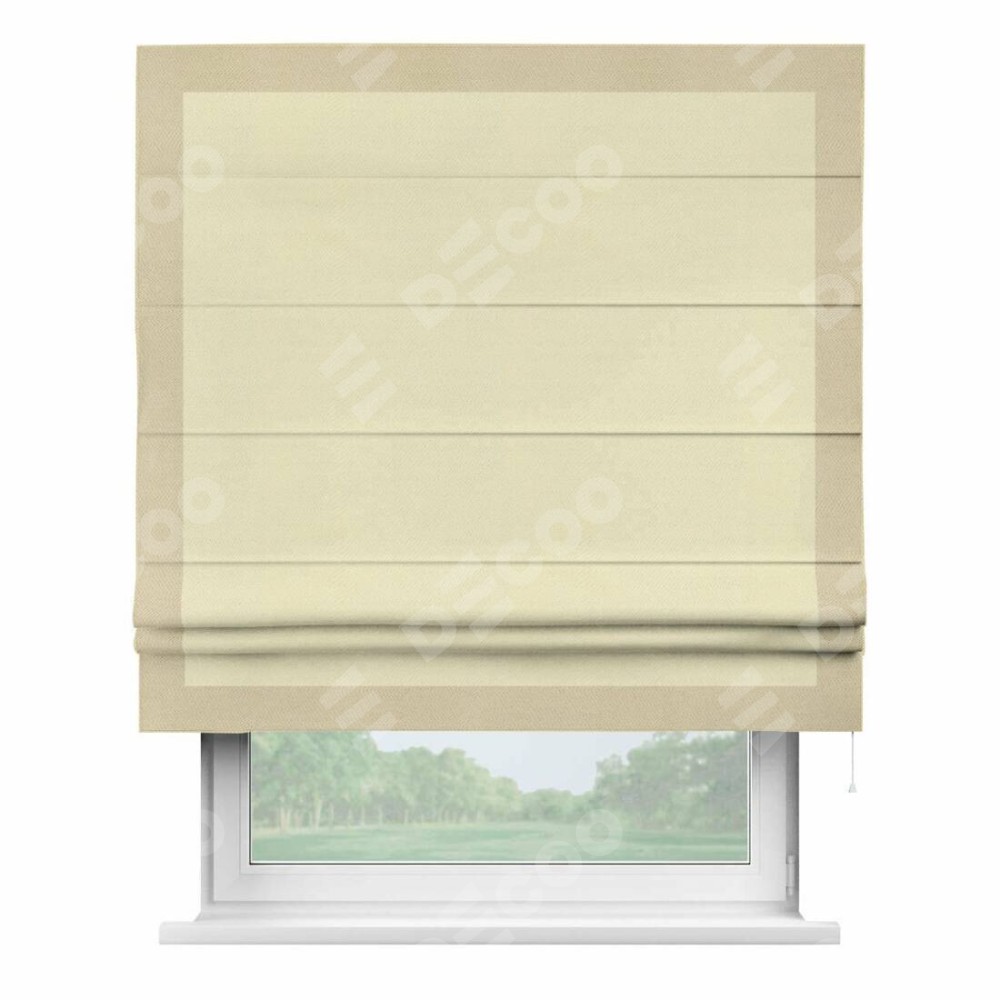 Римская штора производителя «Cortin», используется для проёма, пошита из ткани блэкаут однотонный бежевый, артикул ткани 88283. Отделка шторы кантом «Чесс», ткань для канта используется из блэкаута однотонного разной расцветки на выбор. Имеет универсальный механизм и подходит для монтажа: на потолок, на стену и в нишу.